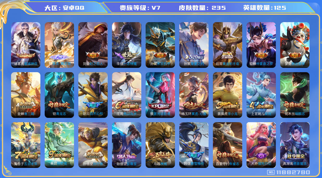 [11882780]V7 1典藏 1无双 8传说 125英雄 235皮肤 可修改实名 优质装备:星域神启(倪克斯贼亮),器灵·螭龙剑,黄金射手座,一念神魔,仲夏夜之梦(大飞蛾),胖达荣荣,时之恋人-刘备(电焊工),末日机甲-孙策,挚爱之约,涂山容容 珍宝阁皮:胡桃夹子,玩趣恶龙 限定皮:鸣野蒿,至尊宝,傲雪梅枪,神威(电光马子),瑞麟志(木兰年限),高山流水,五谷丰年,青龙志(铠年限),梁祝,李小龙,朱雀志(守约年限),孙行者,匿光追影者,寅虎·心曲(虎婆),百木心枪,唐三藏 史诗皮:化蝶舞,百相守梦-黄忠,黄金分割率,江河有灵,高渐离燃音魔法,无限星赏官,冰冠公主,青蛇,偶像歌手,晚萤,末日机甲-吕布,猫狗日记-孙策,猫狗日记-大乔,乱世虎臣,修罗,女仆咖啡,摇滚巨星,水果甜心,绅士熊喵,天才门将,星夜王子,心灵骇客,时之奇旅-安琪拉,功夫厨神,德古拉伯爵,暗隐猎兽者,幽灵船长,鬼剑武藏,心灵战警,天秀·启明,舞动绿茵,纤云弄巧,拒霜思,缤纷独角兽,乘风破浪,逐浪之夏,水晶猎龙者,金属风暴,圣诞狂欢,圣诞恋歌,鹰眼统帅,暗夜贵公子,魅力维加斯,雪上飞焰,千筹问战,无心,未来纪元-赵云