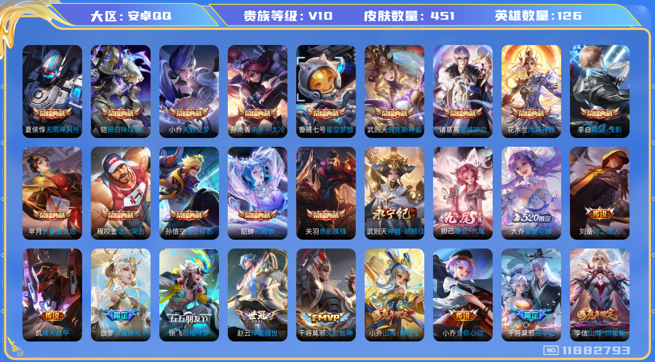 [11882793]V10 14典藏 2无双 77传说 126英雄 451皮肤 典藏英雄武则天 可修改实名 优质装备:天鹅之梦(小乔典藏),星空梦想(太空人),倪克斯神谕(宇宙婆娘),无限飓风号(高达),活力突击,杀手不太冷,大秦宣太后,鸣剑·曳影,全息碎影(猴子典藏),星域神启(倪克斯贼亮),九霄神辉(木兰典藏),赤影疾锋,银白咏叹调(倪克斯侍卫),幻阙歌(貂蝉典藏),神器·明辉仪,青丘·九尾(妲己无双),黄金狮子座,黄金射手座,冠军飞将,云鹰飞将(小将军),绛天战甲(鸡嘴战神),黄金白羊座,猫影幻舞,久胜战神,炽阳神光,一念神魔,云霓雀翎,末日机甲-孙尚香(绿蚂蚱),地狱火,仲夏夜之梦(大飞蛾),音你心动-小乔,零号·赤焰,海洋之心,地狱之眼,飞鸢探春,音你心动-周瑜,胖达荣荣,乞巧织情,时之恋人-刘备(电焊工),游龙清影(小青龙),淬星耀世,超时空战士-狄仁杰,遇见胡旋,末日机甲-孙策,花朝如约(花篮子),挚爱之约,挚爱花嫁,无双飞将,音你闪耀(rap皮),碎云,天秀幻梦,神器·狴犴令,神器·明辉仪,山海·炽霜斩(李信年限),山海·琳琅生(小乔年限),山海·苍雷引(电光曜子),炽翼辉光(娃娃菜牛角包),燃星之曲,画中仙,浮生妄,记忆之芯(机甲兔),青丘·九尾,百相守梦(张飞),追逃游戏(亚瑟),追逃游戏(安琪拉),电玩·雷克斯,鹤羽星尊,灼幽烈阳,妄想实况,艾琳觅芳踪,涂山容容 传说皮:死亡执政官,幻光神枪 珍宝阁皮:优雅恋人,蔷薇恋人 限定皮:鸣野蒿,凤求凰(白切鸡),凤凰于飞,异界灵契(白毛香),傲雪梅枪,补天,寅虎·展翼(孙膑年限),前尘镜,星穹之声,绯月行,白鹤梁神女,时雨天司(水龙头),神威(电光马子),飞衡(韩信年限),玄嵩(庄周年限),山海·碧波行(瑶年限),无限倾心-项羽,诗剑行,无限倾心-虞姬,齐天大圣,匿光决锋者,怒海麟威,降魔,五谷丰年,青龙志(铠年限),冰锋战神,幽恒(沐浴露),天狼运算者,龙胆,烈魂,虎魄,祈雪灵祝(雪兔子),玄武志(苏烈年限),朱雀志(守约年限),永曜之星,辉光之辰,默契交锋-兰陵王,默契交锋-花木兰,一生所爱,引擎之心,美猴王,寅虎·御盾(廉颇年限),寅虎·瑞焰(虎皮蛋子),寅虎·心曲(虎婆),寅虎·赤拳(老虎年限),时之祈愿-云中君,时之祈愿-瑶(瑶传限),百木心枪,玉兔公主,启示之音,无尽星芒,深海之息(深海大菠萝),唐三藏,
