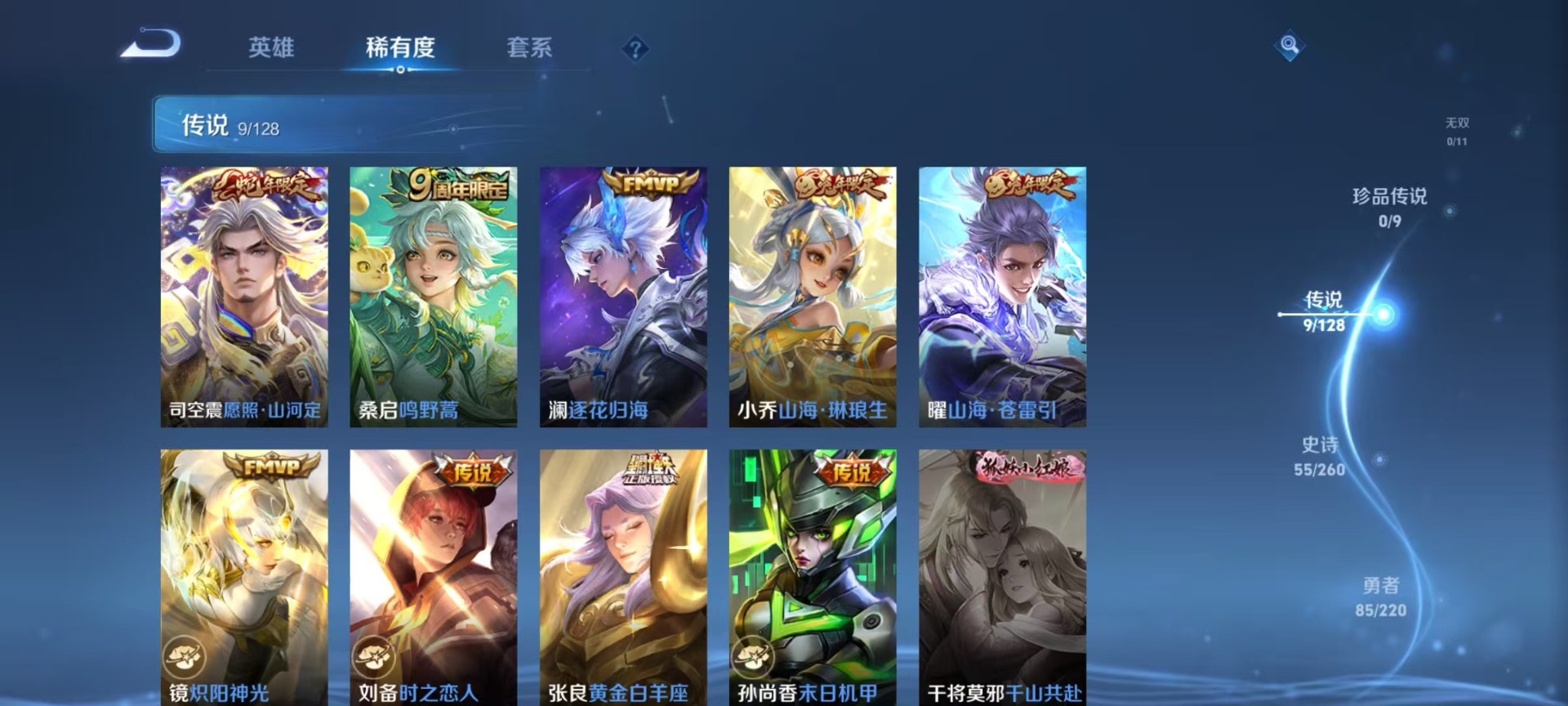 - [12109654]V7 1典藏 3珍品传说 6传说 99英雄 86皮肤 可修改实名 优质装备:最初的交响(伽罗典藏),器灵·落星盏,黑崎一护,黄金射手座 珍品传说:时之奇旅-孙策 传说皮:星之鸣奏,祥瑞亨通,幻光神枪 限定皮:愿照·九州拓(澜年限),愿照·千秋盛(女娲年限),神威(电光马子),山海·玄木吟(马可年限),冰霜神祇 史诗皮:鸭鸭历险记-刘禅,化蝶舞,百相守梦-周瑜,茶境仙,蒙犽顽岩魄,遇见神鹿,紫霞仙子,特工魅影,青蛇,偶像歌手,时之恋人-孙尚香,水果甜心,天才门将,德古拉伯爵,幽灵船长,鬼剑武藏,舞动绿茵,地狱岩魂,诗语江南,乘风破浪,曙光守护者,圣诞狂欢,鹰眼统帅,魅力维加斯,奇遇舞章