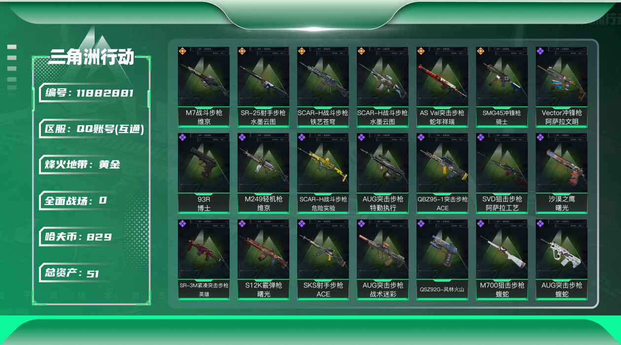 [11882881]总资产:51.7M 2干员外观 6传说枪械 哈夫币:829.446K 可二次 可修改实名 烽火地带段位:黄金 全面战场段位:列兵 传说武器皮肤:SR-25射手步枪-水墨云图,SCAR-H战斗步枪-水墨云图,AS Val突击步枪-蛇年祥瑞,SCAR-H战斗步枪-铁艺苍穹,SMG45冲锋枪-骑士,M7战斗步枪-维京 史诗武器皮肤:SMG-45冲锋枪-飓风行动,SR-3M紧凑突击步枪-英雄,QBZ95-1突击步枪-ACE,AUG突击步枪-特勤执行,Vector冲锋枪-红色彗星,SKS射手步枪-ACE,AUG突击步枪-蝮蛇,M700狙击步枪-蝮蛇,G3战斗步枪-战场英杰,AKM突击步枪-林中猎手,M1014霰弹枪-林中猎手,M249轻机枪-维京,SCAR-H战斗步枪-危险实验,沙漠之鹰-曙光,Vector冲锋枪-阿萨拉文明,SVD狙击步枪-阿萨拉工艺,S12K霰弹枪-曙光,QSZ92G-风林火山,93R-博士,AUG突击步枪-战术迷彩 干员外观:牧羊人-街头之王,骇爪-水墨云图
