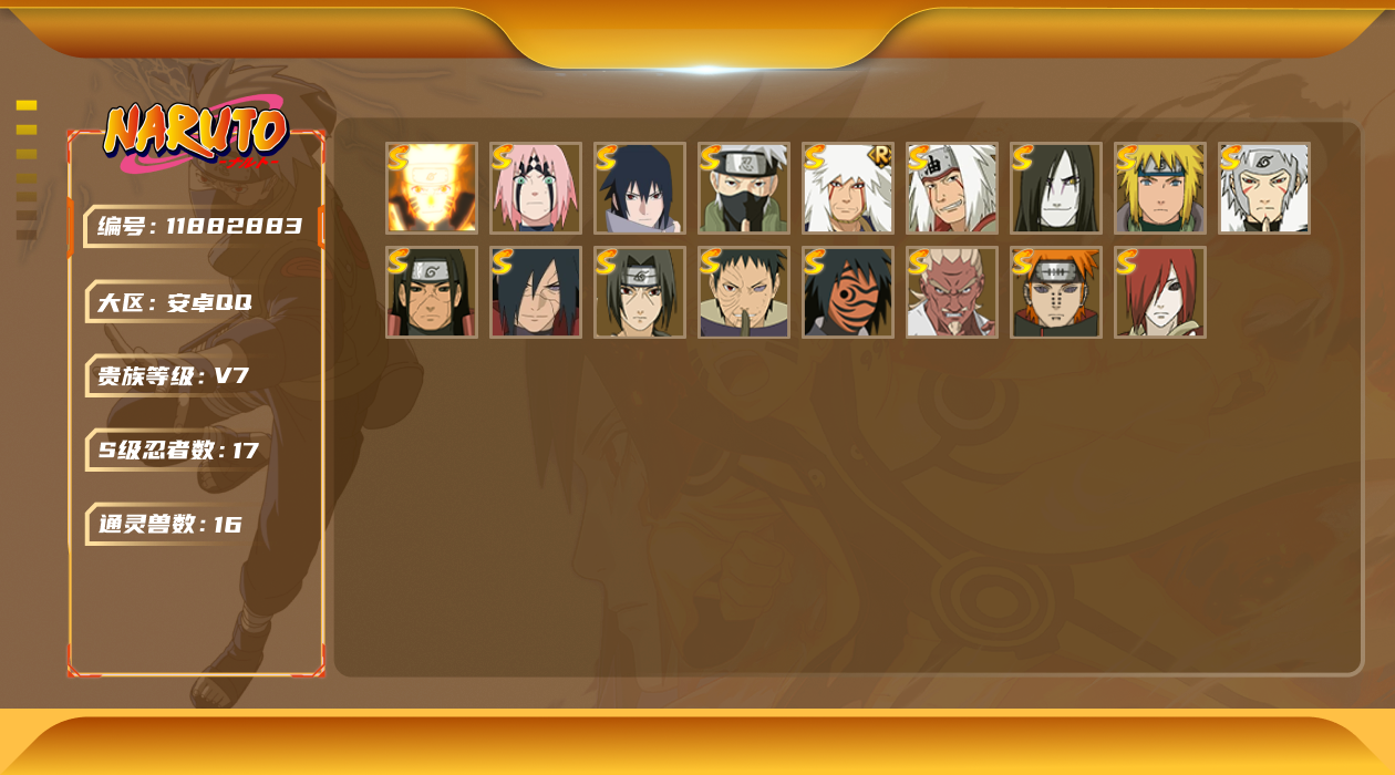 [11882883]V7 17S忍 35A忍 16通灵 604.6W战力 可二次 可修改实名 优质装备:千手柱间「秽土转生」,长门「秽土转生」,千手扉间,宇智波带土 「忍界大战」,漩涡鸣人 「九喇嘛连结」,春野樱 「忍界大战」,神秘面具男 「红夜之刃」,宇智波佐助「永恒万花筒」,宇智波斑「秽土转生·解」,艾「忍界大战」,旗木卡卡西「须佐能乎」,自来也 「传说中的三忍」 S级忍者:自来也 「舞之豪杰」,宇智波鼬 「须佐能乎」,佩恩「天道」,波风水门,大蛇丸