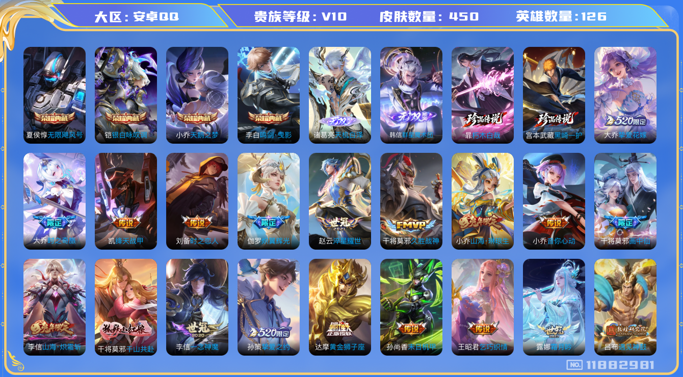 [11882981]V10 4典藏 2无双 2珍品传说 63传说 126英雄 450皮肤 典藏英雄武则天 可修改实名 优质装备:天鹅之梦(小乔典藏),无限飓风号(高达),鸣剑·曳影,银白咏叹调(倪克斯侍卫),韩信群星魔术团(韩信无双),天机白泽,朽木白哉,黑崎一护,黄金狮子座,黄金射手座,冠军飞将,云鹰飞将(小将军),绛天战甲(鸡嘴战神),黄金白羊座,猫影幻舞,久胜战神,炽阳神光,一念神魔,云霓雀翎,末日机甲-孙尚香(绿蚂蚱),地狱火,仲夏夜之梦(大飞蛾),音你心动-小乔,零号·赤焰,地狱之眼,音你心动-周瑜,李逍遥,乞巧织情,时之恋人-刘备(电焊工),游龙清影(小青龙),淬星耀世,超时空战士-狄仁杰,遇见胡旋,挚爱之约,挚爱花嫁,无双飞将,碎云,山海·炽霜斩(李信年限),山海·琳琅生(小乔年限),山海·苍雷引(电光曜子),炽翼辉光(娃娃菜牛角包),燃星之曲,画中仙,浮生妄,妄想实况,遇见神鼓,大乔-时之奇旅,霜月吟,澜逐花归海,艾琳觅芳踪,黄金天蝎座,诡秘之主,千山共赴,涂山容容 传说皮:落雪白狼,九山相柳 珍宝阁皮:万物之道,女武神,玩趣恶龙 限定皮:鸣野蒿,至尊宝,凤求凰(白切鸡),异界灵契(白毛香),补天,白晶晶,神威(电光马子),山海·碧波行(瑶年限),无限倾心-项羽,至美·乘鲤谣,至美·化雀舞,影龙天霄,遇见飞天,高山流水,诗剑行,无限倾心-虞姬,齐天大圣,怒海麟威,五谷丰年,冰锋战神,武圣,天狼运算者,梁祝,天狼狩猎者,龙胆,烈魂,岱宗(典韦年限),天狼溯光者,虎魄,祈雪灵祝(雪兔子),天狼绘梦者,李小龙,默契交锋-兰陵王,默契交锋-花木兰,孙行者,云端筑梦师,乒乒小将,蜜橘之夏,匿光追影者,深海之息(深海大菠萝),山海·玄木吟(马可年限) 史诗皮:赞萌露比,鸭鸭历险记-刘禅,灵蛊蚀心,星界战将,龙之律动,石田雨龙,百相守梦-周瑜,戍鼓铭心,幻珠鲛人,怒海争锋,芈月浮光幕影,琥珀纪元伽罗,夜落电台,蔬乡物语(鲁班七号),百相守梦-黄忠,织梦人,遇见神鹿,紫霞仙子,苍穹之光,电玩小子(小书包),白龙吟,黄金分割率,特工魅影,千年之狐,江河有灵,魅语,百解令(蒙犽),高渐离燃音魔法,蒙恬荣光圣徽,无限星赏官,冰冠公主,青蛇,偶像歌手,晚萤,电玩·爆裂旋风,暗夜猫娘,龙骑士(小龙虾),末日机甲-吕布,猫狗日记-孙策,猫狗日记-大乔,时之恋人-孙尚香,乱世虎臣,节奏热浪,修