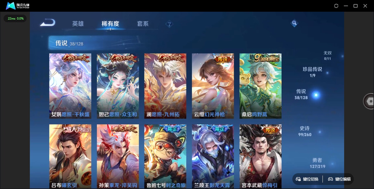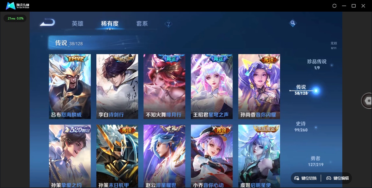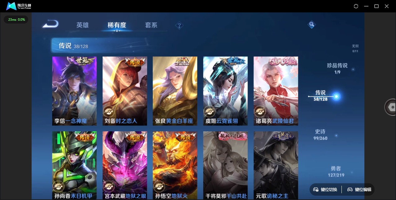 - [11625830]V8 1典藏 17传说 123英雄 280皮肤 可修改实名 连体和平 优质装备:鸣剑·曳影,黄金狮子座,云鹰飞将(小将军),猫影幻舞,一念神魔,云霓雀翎,仲夏夜之梦(大飞蛾),零号·赤焰,地狱之眼,时之恋人-刘备(电焊工),超时空战士-狄仁杰 珍宝阁皮:优雅恋人,玩趣恶龙 限定皮:鸣野蒿,至尊宝,白虎志(电光耗子),武陵仙君(小桃花),傲雪梅枪,补天,白晶晶,时雨天司(水龙头),神威(电光马子),飞衡(韩信年限),高山流水,五谷丰年,青龙志(铠年限),冰锋战神,天狼运算者,游园惊梦,梁祝,御风骁将(吕布年限),逐梦之星,虎魄,祈雪灵祝(雪兔子),李小龙,逐梦之影,默契交锋-花木兰,孙行者,大圣娶亲,冰霜恋舞曲,神奇女侠,百木心枪 史诗皮:紫霞仙子,苍穹之光,电玩小子(小书包),白龙吟,黄金分割率,特工魅影,千年之狐,永昼,电玩·爆裂旋风,江河有灵,高渐离燃音魔法,蒙恬荣光圣徽,偶像歌手,暗夜猫娘,魅语,晚萤,末日机甲-吕布,猫狗日记-孙策,时之恋人-孙尚香,乱世虎臣,节奏热浪,修罗,女仆咖啡,摇滚巨星,水果甜心,天才门将,星夜王子,心灵骇客,功夫厨神,暗隐猎兽者,幽灵船长,鬼剑武藏,暗渊魔法,心灵战警,舞动绿茵,地狱岩魂,纤云弄巧,繁星吟游(呼啦呼啦),拒霜思,缤纷独角兽,乘风破浪,逐浪之夏,水晶猎龙者,曙光守护者,金属风暴,原初追逐者,圣诞狂欢,圣诞恋歌,鹰眼统帅,暗夜贵公子,魅力维加斯,黎明之约,无心