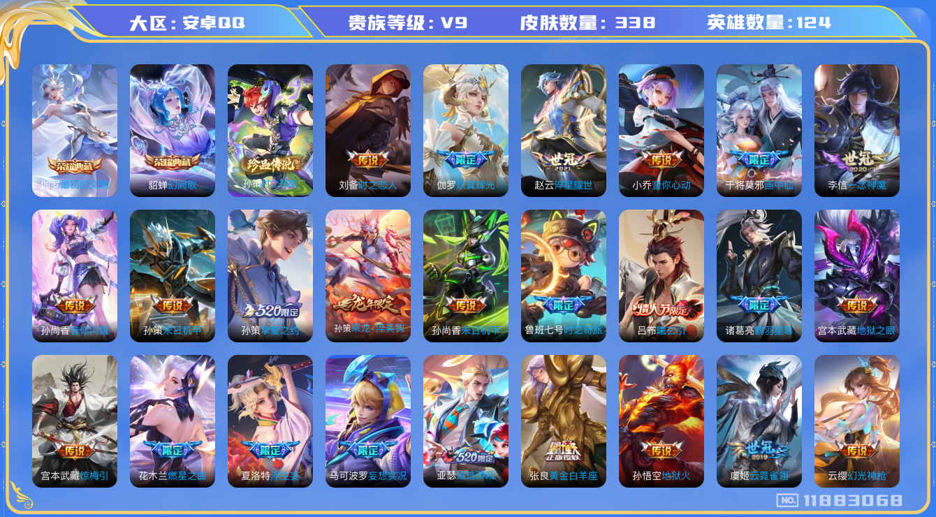 [11883068]V9 2典藏 1珍品传说 38传说 124英雄 338皮肤 可修改实名 优质装备:幻阙歌(貂蝉典藏),最初的交响(伽罗典藏),黄金白羊座,一念神魔,云霓雀翎,末日机甲-孙尚香(绿蚂蚱),地狱火,音你心动-小乔,地狱之眼,时之恋人-刘备(电焊工),淬星耀世,末日机甲-孙策,挚爱之约,音你闪耀(rap皮),炽翼辉光(娃娃菜牛角包),燃星之曲,画中仙,浮生妄,追逃游戏(亚瑟),鹤羽星尊,妄想实况,鹤归松栖(云缨),惊梅引,鲁班七号-时之奇旅 珍品传说:时之奇旅-孙策 传说皮:乘龙·淬吴钩(孙策年限),吕布曦玄引,幻光神枪 珍宝阁皮:万物之道,女武神 限定皮:愿照·九州拓(澜年限),愿照·众生和(妲己年限),愿照·千秋盛(女娲年限),逐霄战戟,鸣野蒿,武陵仙君(小桃花),星穹之声,绯月行,玄嵩(庄周年限),山海·碧波行(瑶年限),无限倾心-项羽,至美·乘鲤谣,影龙天霄,诗剑行,无限倾心-虞姬,匿光决锋者,怒海麟威,五谷丰年,青龙志(铠年限),梁祝,龙胆,天狼绘梦者,如梦令-后羿,云端筑梦师,热情桑巴,时之祈愿-云中君,唐三藏,山海·玄木吟(马可年限) 史诗皮:鸭鸭历险记-刘禅,化蝶舞,龙之律动,石田雨龙,破空之剑,东方月初,芈月浮光幕影,琥珀纪元伽罗,遇见神鹿,紫霞仙子,电玩小子(小书包),黄金分割率,特工魅影,千年之狐,永昼,江河有灵,匿光侦查者,鹤归松栖(赵怀真),百解令(蒙犽),高渐离燃音魔法,蒙恬荣光圣徽,冰冠公主,青蛇,偶像歌手,晚萤,电玩·爆裂旋风,百相守梦(刘备),百相守梦(关羽),末日机甲-吕布,猫狗日记-孙策,时之恋人-孙尚香,乱世虎臣,节奏热浪,修罗,女仆咖啡,摇滚巨星,水果甜心,绅士熊喵,天才门将,星夜王子,心灵骇客,功夫厨神,德古拉伯爵,暗隐猎兽者,幽灵船长,鬼剑武藏,暗渊魔法,心灵战警,天秀·启明,舞动绿茵,地狱岩魂,纤云弄巧,拒霜思,缤纷独角兽,乘风破浪,逐浪之夏,水晶猎龙者,曙光守护者,箭羽风息,金属风暴,圣诞狂欢,圣诞恋歌,鹰眼统帅,暗夜贵公子,魅力维加斯,黎明之约,奇遇舞章,滕王阁序,千筹问战,无心,未来纪元-赵云