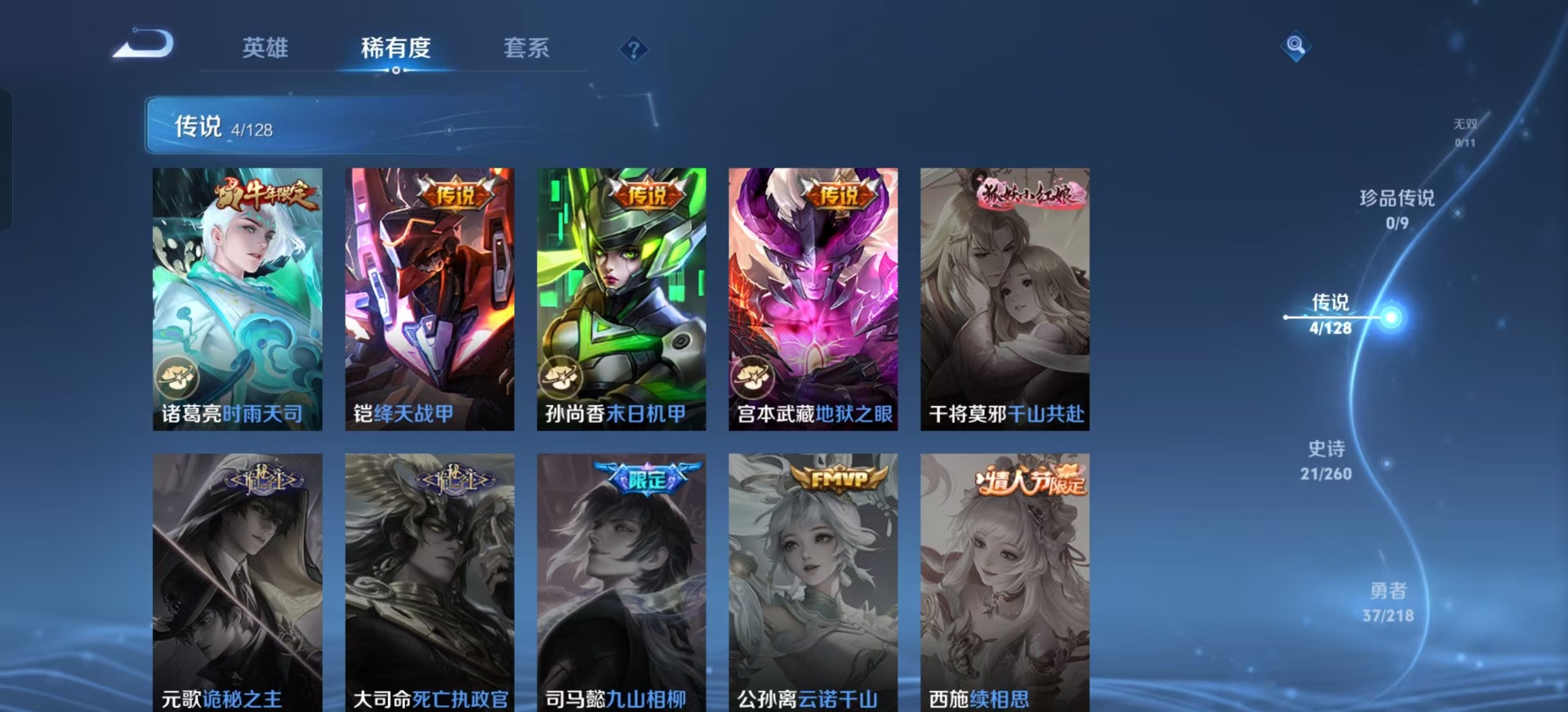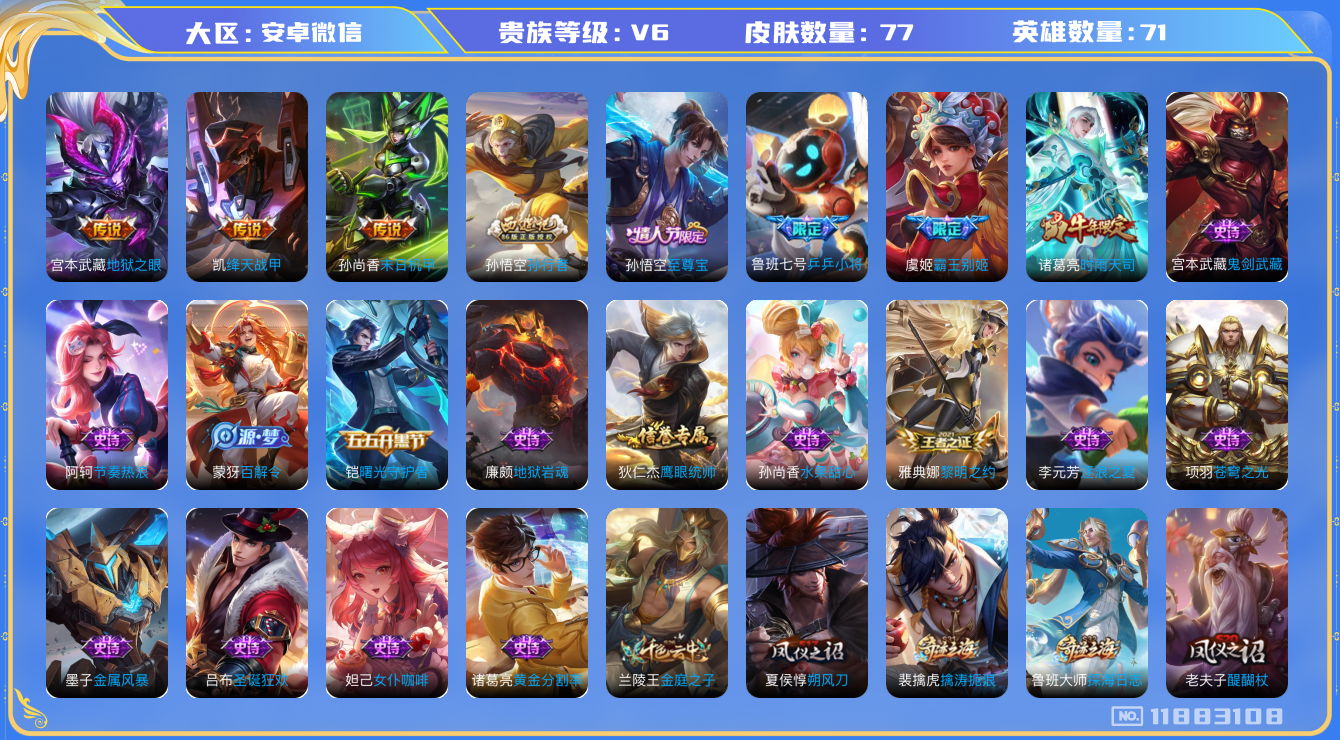 - PX_2095055-实名: 可修改 贵族等级: V5 英雄数: 123 皮肤数: 111 传说皮: 山海·苍雷引 限定皮: 梁祝,五谷丰年,诗剑行,鸣野蒿