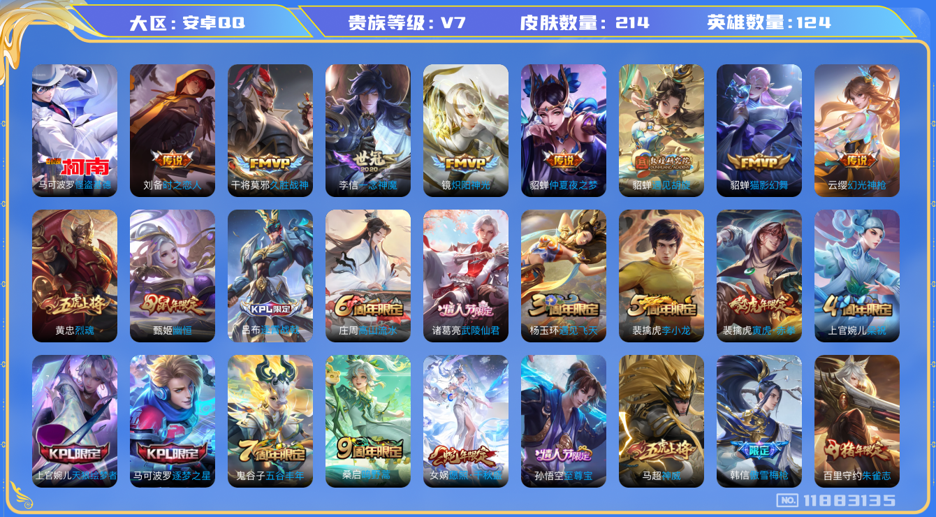 [11883135]V7 1珍品传说 13传说 124英雄 214皮肤 可修改实名 优质装备:怪盗基德,猫影幻舞,久胜战神,炽阳神光,一念神魔,仲夏夜之梦(大飞蛾),时之恋人-刘备(电焊工),遇见胡旋 传说皮:幻光神枪 珍宝阁皮:蔷薇恋人,玩趣恶龙 限定皮:愿照·九州拓(澜年限),愿照·千秋盛(女娲年限),逐霄战戟,鸣野蒿,至尊宝,凤凰于飞,武陵仙君(小桃花),傲雪梅枪,神威(电光马子),遇见飞天,高山流水,五谷丰年,冰锋战神,幽恒(沐浴露),梁祝,逐梦之星,烈魂,天狼绘梦者,李小龙,朱雀志(守约年限),如梦令-嫦娥,寅虎·赤拳(老虎年限) 史诗皮:鸭鸭历险记-刘禅,器灵·浮梦炉,紫霞仙子,苍穹之光,黄金分割率,特工魅影,魅语,蒙恬荣光圣徽,青蛇,偶像歌手,百相守梦(刘备),龙骑士(小龙虾),猫狗日记-大乔,节奏热浪,女仆咖啡,摇滚巨星,水果甜心,天才门将,功夫厨神,德古拉伯爵,暗隐猎兽者,舞动绿茵,地狱岩魂,诗语江南,繁星吟游(呼啦呼啦),拒霜思,乘风破浪,水晶猎龙者,箭羽风息,金属风暴,原初追逐者,圣诞狂欢,圣诞恋歌,鹰眼统帅,暗夜贵公子,魅力维加斯,黎明之约