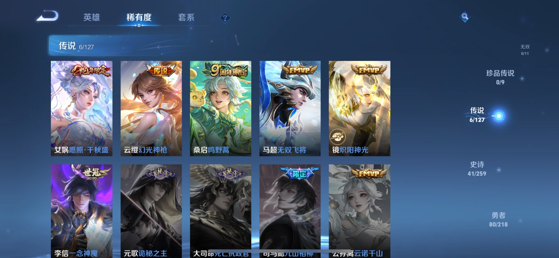 - PX_2057222-贵族等级: V7 英雄数: 124 皮肤数: 252 星传说: 零号·雷霆 传说皮: 黄金射手座,绛天战甲,久胜战神,炽阳神光,一念神魔,零号·赤焰,淬星耀世,超时空战士-狄仁杰,澜逐花归海,乘龙·铭钟鼎,乘龙·淬吴钩,牧神诗旅,云诺千山 限定皮: 遇见飞天,李小龙,梁祝,岱宗,神威,青龙志,高山流水,五谷丰年,山海·玄木吟,鸣野蒿
