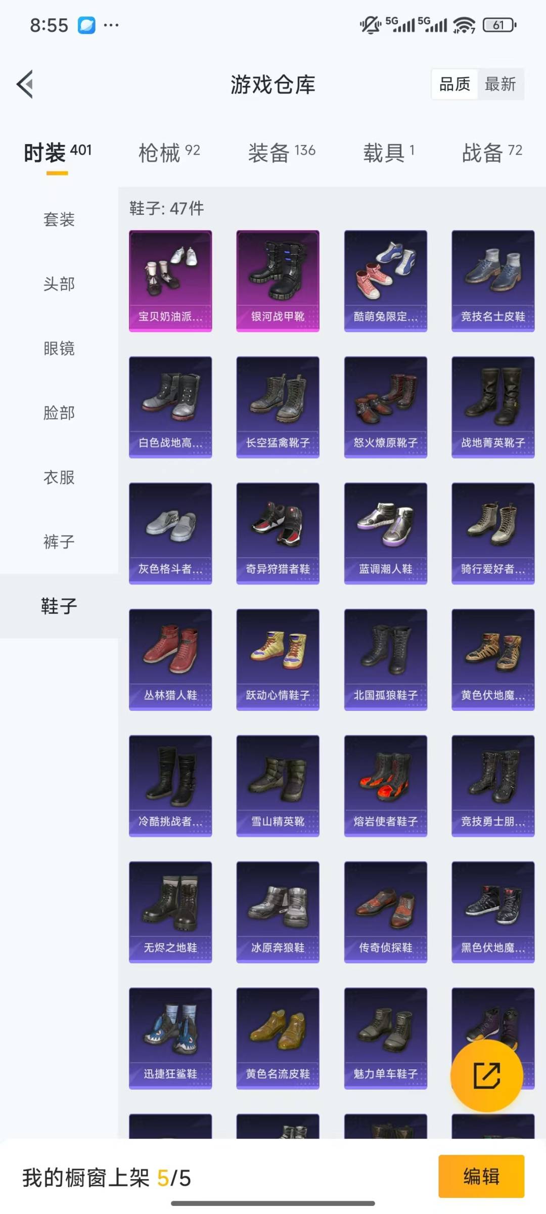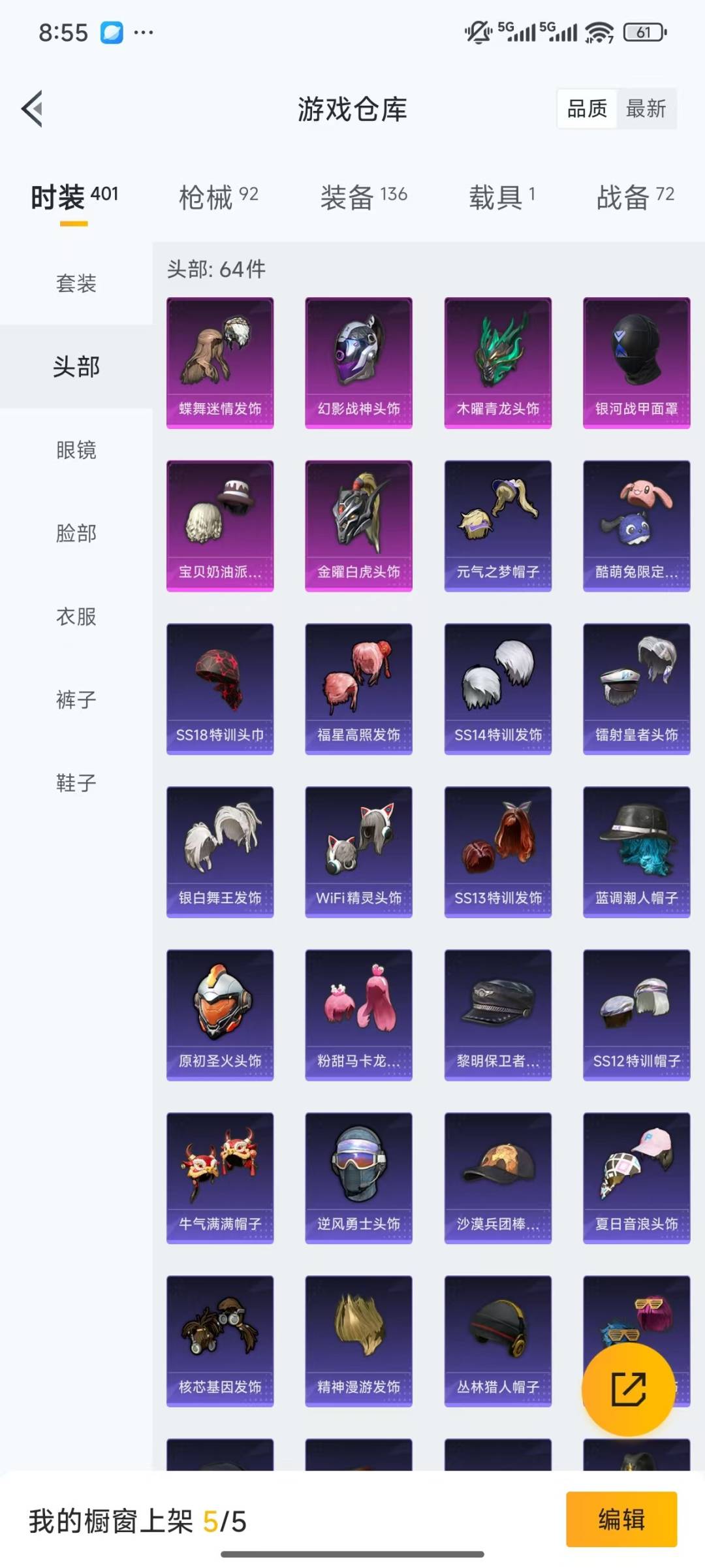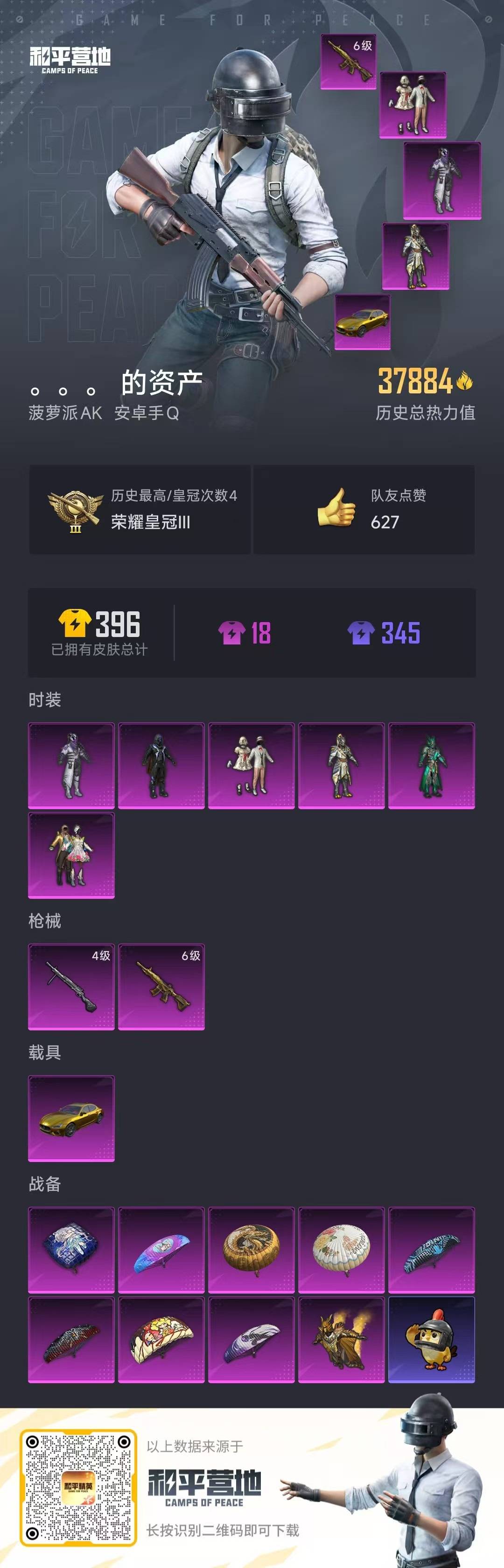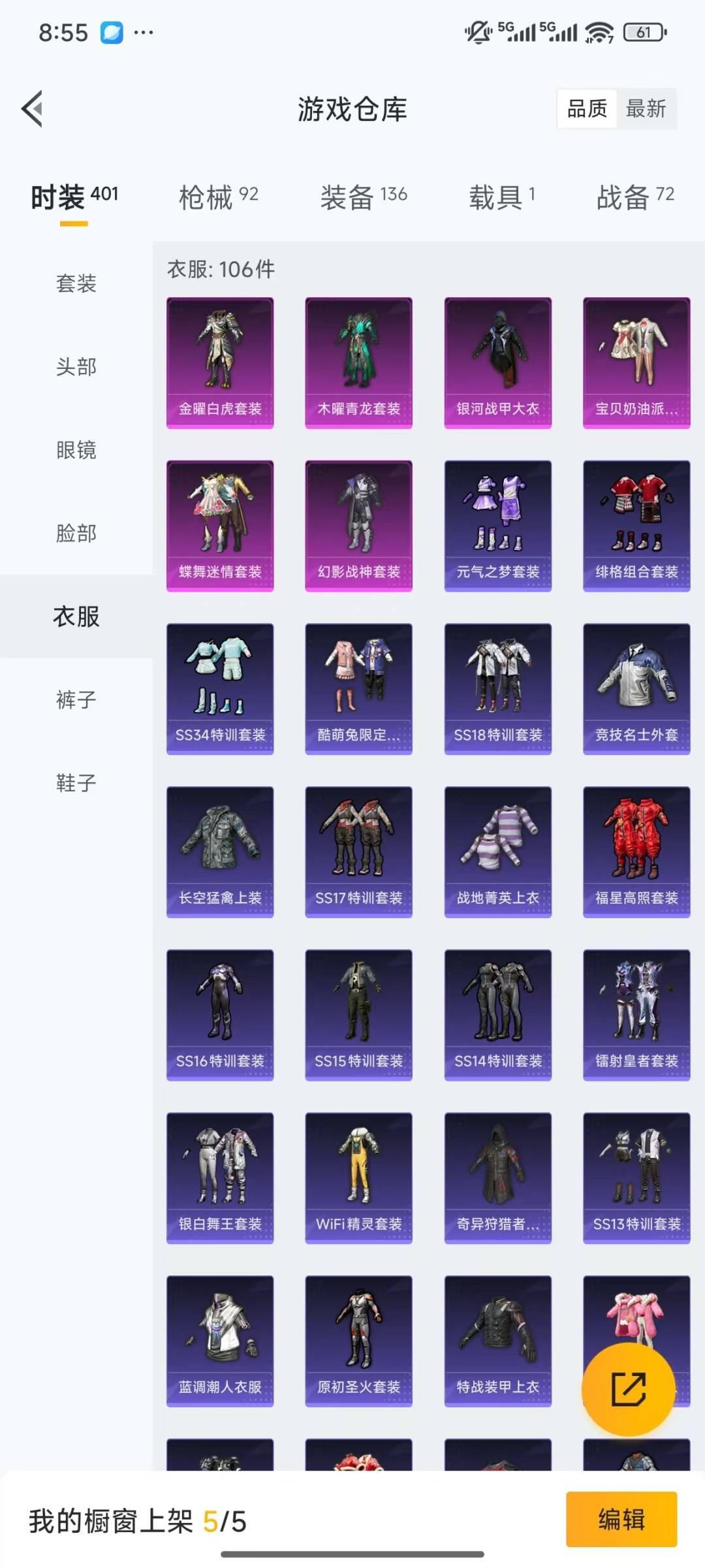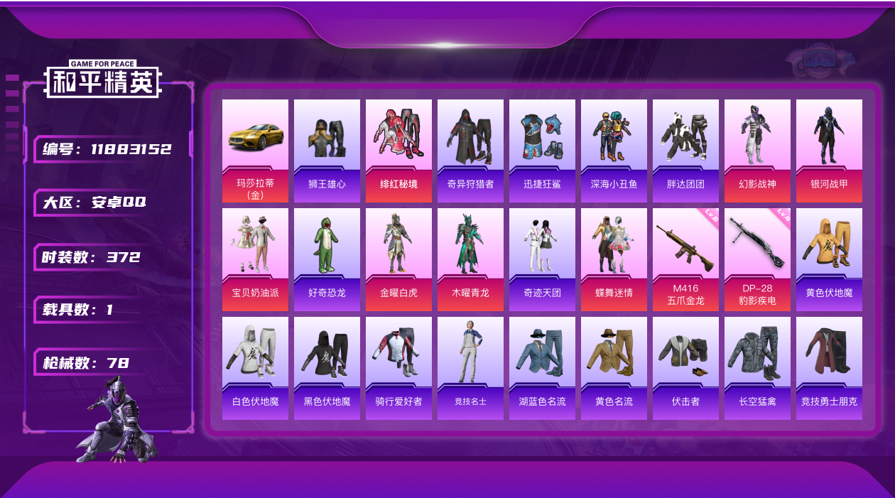 [11883152]6粉装 2特效枪 1载具 可二次 可修改实名 优质装备:玛莎拉蒂Ghibli(金),M416五爪金龙,奇异狩猎者,蝶舞迷情,幻影战神,宝贝奶油派,银河战甲,木曜青龙,金曜白虎 热门装扮:奇迹天团,胖达团团,狮王雄心,迅捷狂鲨,深海小丑鱼,好奇恐龙,绯红秘境 稀有枪皮:DP-28-豹影疾电 六级特效枪:六级M416-五爪金龙 四级特效枪:四级DP-28-豹影疾电 紫色装扮:SS5特训,伏击者,冷焰舞者,凛冬战士,北国孤狼,SS15特训,SS16特训,银白舞王,SS13特训,SS14特训,SS17特训,SS18特训,酷萌兔限定,金鼠迎春,长空猛禽,雪山征服者,雪山精英,霓虹街区,荣耀,跃动心情,骑行爱好者,魅力单车,黄色伏地魔,黄色名流,黑色伏地魔,格斗先锋,沙漠兵团,圣诞大吉,怒火燎原,战地督导,战地菁英,湖蓝色名流,疯狂小兔子,白色伏地魔,甜蜜告白,福星高照,竞技勇士朋克,潮流先锋,灰色格斗者,熔岩使者,燃烧卡路里,牛气满满,特战装甲,特殊使命,特训学院,镭射皇者,竞技名士,精神漫游,炽焰拳师,格斗专家,SS6特训,核芯基因,拳皇97八神庵,SS7特训,火舞潮人,淡雅花蕊,裁决冥王,浴火魔神,摩艾涂鸦,奇趣章鱼,时之沙漏,SS8特训,粉甜马卡龙,原初圣火,逆风勇士,SS12特训,SS9特训,SS11特训,绯格组合,蓝调潮人,冷酷挑战者,摇滚战魂,绯红秘境,无烬之地,冰原奔狼,忍者信条,WiFi精灵,丛林猎人,传奇侦探,奇趣企鹅,爆竹金鼠 优质战备:幻影战神降落伞,甜心宝贝降落伞,凝视深渊降落伞,至尊龙雀飞行服,至尊龙雀降落伞,银河战甲降落伞,春暖花开降落伞,深海曼妙降落伞,洛神天依降落伞