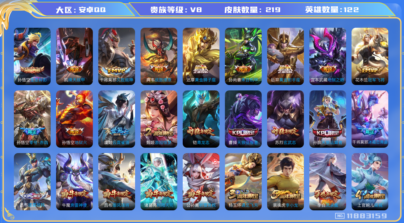 [11883159]V8 1典藏 15传说 122英雄 219皮肤 可修改实名 优质装备:全息碎影(猴子典藏),黄金狮子座,黄金射手座,冠军飞将,绛天战甲(鸡嘴战神),久胜战神,云霓雀翎,末日机甲-孙尚香(绿蚂蚱),地狱火,零号·赤焰,地狱之眼 传说皮:典韦战鼓燎原 珍宝阁皮:优雅恋人 限定皮:逐霄战戟,凤求凰(白切鸡),时雨天司(水龙头),瑞麟志(木兰年限),遇见飞天,五谷丰年,青龙志(铠年限),冰锋战神,天狼运算者,游园惊梦,梁祝,御风骁将(吕布年限),逐梦之星,天狼征服者,奔雷神使(牛魔年限),祈雪灵祝(雪兔子),李小龙,玄武志(苏烈年限),朱雀志(守约年限),霸王别姬-虞姬,猪悟能,大圣娶亲,引擎之心,冰霜恋舞曲 史诗皮:星界特工,电玩小子(小书包),白龙吟,黄金分割率,特工魅影,千年之狐,永昼,魅语,百解令(蒙犽),无限星赏官,冰冠公主,偶像歌手,末日机甲-吕布,时之恋人-孙尚香,乱世虎臣,节奏热浪,女仆咖啡,摇滚巨星,星夜王子,心灵骇客,德古拉伯爵,暗隐猎兽者,鬼剑武藏,舞动绿茵,地狱岩魂,纤云弄巧,拒霜思,缤纷独角兽,乘风破浪,逐浪之夏,水晶猎龙者,唤灵魅影,金属风暴,原初追逐者,圣诞狂欢,圣诞恋歌,鹰眼统帅,魅力维加斯,赏金猎手,天秀·音浪,无心,未来纪元-赵云