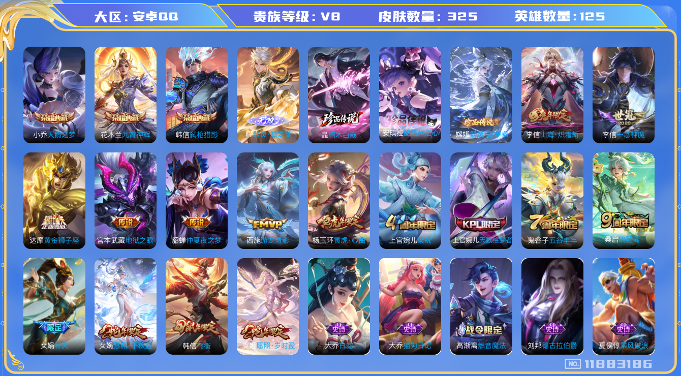 [11883186]V8 3典藏 1无双 3珍品传说 11传说 125英雄 325皮肤 可修改实名 优质装备:天鹅之梦(小乔典藏),九霄神辉(木兰典藏),弑枪猎影(韩信典藏),器灵·螭龙剑,器灵·落星盏,酷洛米之心,朽木白哉,黄金狮子座,一念神魔,仲夏夜之梦(大飞蛾),地狱之眼,游龙清影(小青龙),山海·炽霜斩(李信年限) 珍宝阁皮:优雅恋人,女武神 限定皮:愿照·岁时盈(虞姬年限),愿照·千秋盛(女娲年限),鸣野蒿,补天,飞衡(韩信年限),五谷丰年,梁祝,天狼绘梦者,寅虎·心曲(虎婆) 史诗皮:鸭鸭历险记-刘禅,器灵·浮梦炉,化蝶舞,星界战将,谪仙醉月,龙之律动,石田雨龙,茶境仙,怒海争锋,破空之剑,蒙犽顽岩魄,琥珀纪元伽罗,上官婉儿群星魔术团,蔬乡物语(鲁班七号),百相守梦-百里守约,百相守梦-黄忠,织梦人,遇见神鹿,紫霞仙子,电玩小子(小书包),黄金分割率,特工魅影,千年之狐,永昼,江河有灵,魅语,百解令(蒙犽),高渐离燃音魔法,蒙恬荣光圣徽,无限星赏官,冰冠公主,青蛇,偶像歌手,白蛇,电玩·爆裂旋风,暗夜猫娘,龙骑士(小龙虾),末日机甲-吕布,猫狗日记-孙策,猫狗日记-大乔,乱世虎臣,修罗,女仆咖啡,摇滚巨星,水果甜心,绅士熊喵,天才门将,星夜王子,心灵骇客,功夫厨神,德古拉伯爵,暗隐猎兽者,幽灵船长,鬼剑武藏,心灵战警,天秀·启明,舞动绿茵,地狱岩魂,纤云弄巧,繁星吟游(呼啦呼啦),拒霜思,缤纷独角兽,乘风破浪,逐浪之夏,月团寄思,水晶猎龙者,曙光守护者,箭羽风息,金属风暴,圣诞狂欢,圣诞恋歌,鹰眼统帅,王者之锤,暗夜贵公子,魅力维加斯,黎明之约,滕王阁序,无心,未来纪元-赵云