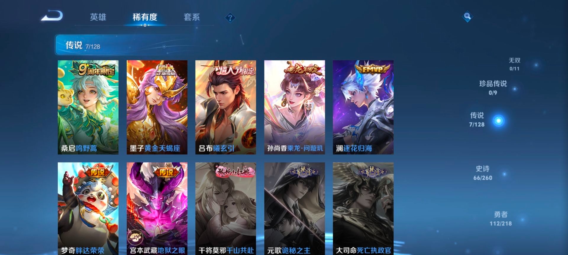 - [11517652]V6 5传说 117英雄 131皮肤 可修改实名 优质装备:云鹰飞将(小将军),云霓雀翎,澜逐花归海 珍宝阁皮:妄想食味 限定皮:逐霄战戟,鸣野蒿,飞衡(韩信年限),李小龙,无尽星芒 史诗皮:鸭鸭历险记-刘禅,飞车小橘子,器灵·浮梦炉,化蝶舞,龙之律动,石田雨龙,战舞者,蒙犽顽岩魄,埋骨钱,谪仙醉月,蔬乡物语(鲁班七号),紫霞仙子,特工魅影,千年之狐,江河有灵,百解令(蒙犽),龙骑士(小龙虾),末日机甲-吕布,猫狗日记-孙策,猫狗日记-大乔,时之恋人-孙尚香,水果甜心,天才门将,暗隐猎兽者,鬼剑武藏,乐园奇幻夜,地狱岩魂,拒霜思,乘风破浪,逐浪之夏,月团寄思,水晶猎龙者,曙光守护者,箭羽风息,圣诞恋歌,赏金猎手