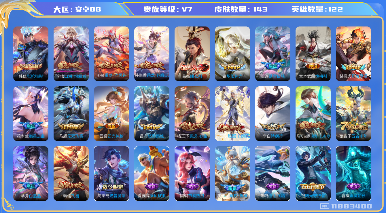 [11883400]V7 1典藏 14传说 122英雄 143皮肤 可修改实名 优质装备:弑枪猎影(韩信典藏),炽阳神光,无双飞将,山海·炽霜斩(李信年限),燃星之曲,惊梅引 传说皮:乘龙·问璇玑(孙尚香年限),乘龙·淬吴钩(孙策年限),吕布曦玄引,落雪白狼,祥瑞亨通,幻光神枪 珍宝阁皮:妄想食味 限定皮:愿照·山河定(司空震年限),白晶晶,飞衡(韩信年限),诗剑行,怒海麟威,五谷丰年,寅虎·心曲(虎婆),山海·玄木吟(马可年限) 史诗皮:龙之律动,藏狐·褐绒,乘龙·聚宝船(安琪拉年限),紫霞仙子,永昼,末日机甲-莱西奥,魅语,高渐离燃音魔法,蒙恬荣光圣徽,无限星赏官,青蛇,晚萤,百相守梦(关羽),乱世虎臣,节奏热浪,摇滚巨星,水果甜心,绅士熊喵,暗隐猎兽者,幽灵船长,乘风破浪,曙光守护者,金属风暴,圣诞恋歌,鹰眼统帅,魅力维加斯,黎明之约,雪上飞焰,无心