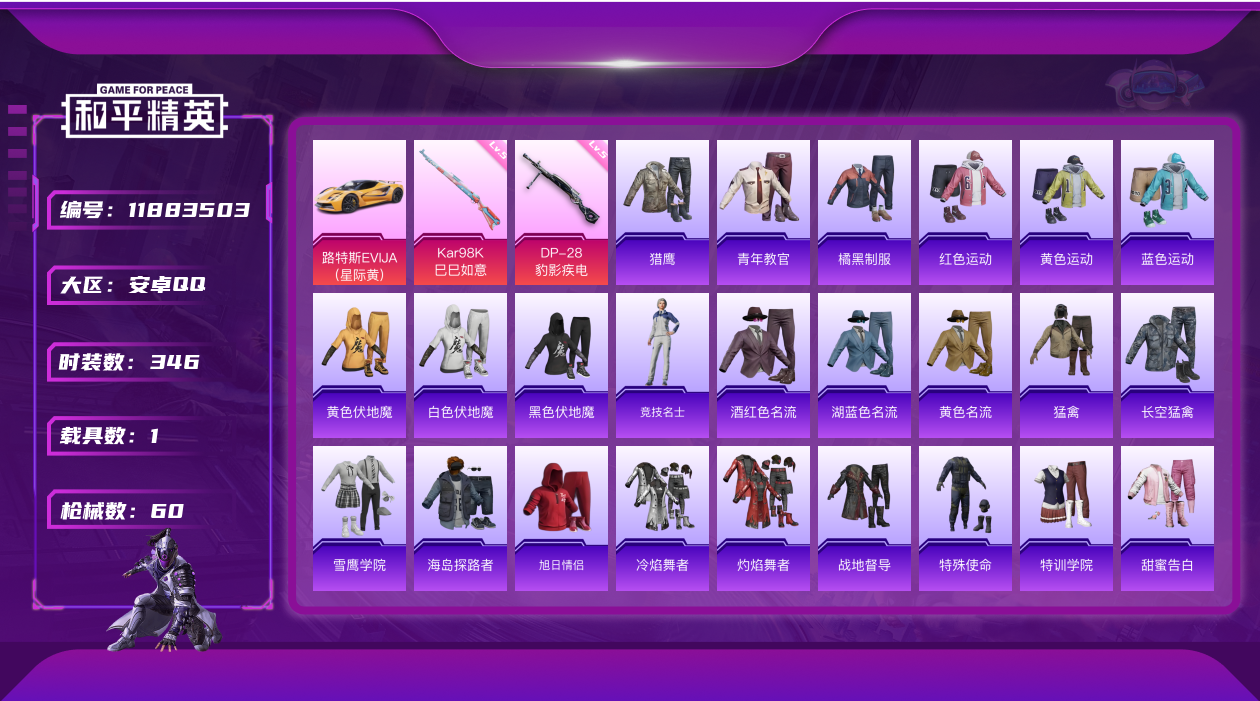 [11883503]2特效枪 1载具 7印记 可二次 可修改实名 优质装备:路特斯EVIJA(星际黄),Kar98K-巳巳如意 稀有枪皮:DP-28-豹影疾电 五级特效枪:五级Kar98K-巳巳如意,五级DP-28-豹影疾电 紫色装扮:SS22特训,SS23特训,娇憨猪猪,萌趣咩咩,SS21特训,人气偶像,冰川特警,冷焰舞者,旭日情侣,SS33特训套装,顶瓜瓜,SS20特训,飞驰魅影,音速流光,SS19特训,都市魅力,酒红色名流,长空猛禽,雪鹰学院,霓虹街区,青年教官,缤纷果语,蓝彩潮人,蓝色运动,街头潮人,无面战甲,飞行日记,魅力单车,鹤鸣,麻辣教官,黄色伏地魔,黄色名流,黄色运动,黑色伏地魔,龟仙人,极速红龙,橘黑制服,暗金炫舞,海岛探路者,深蓝色名流,幻影武者,完美偶像,帅气教官,幻世战舞者,战地督导,探宝勇士,湖蓝色名流,绮丽涂鸦,白色伏地魔,破晓战魂,破蛋小黄鸡,甜蜜告白,空岛之星,竞技达人朋克,红色运动,牛气冲天,灰色格斗者,灼焰舞者,牛气满满,猛禽,特殊使命,特训学院,狂沙舞者,猎鹰,SS29特训,米开朗基罗,SS28特训,异域银装,玉兔迎春,巳巳如意,竞技名士,SS24特训(SS24特训套装),SS25特训,粉红小猪,SS27特训,SS26特训,智谋强哥,精神漫游,风华少年志,耀粉歌者,青玉碎影,绯格组合,白糯汤圆,恋语绒绒,光之冒险 优质战备:垂柳戏鸭降落伞
