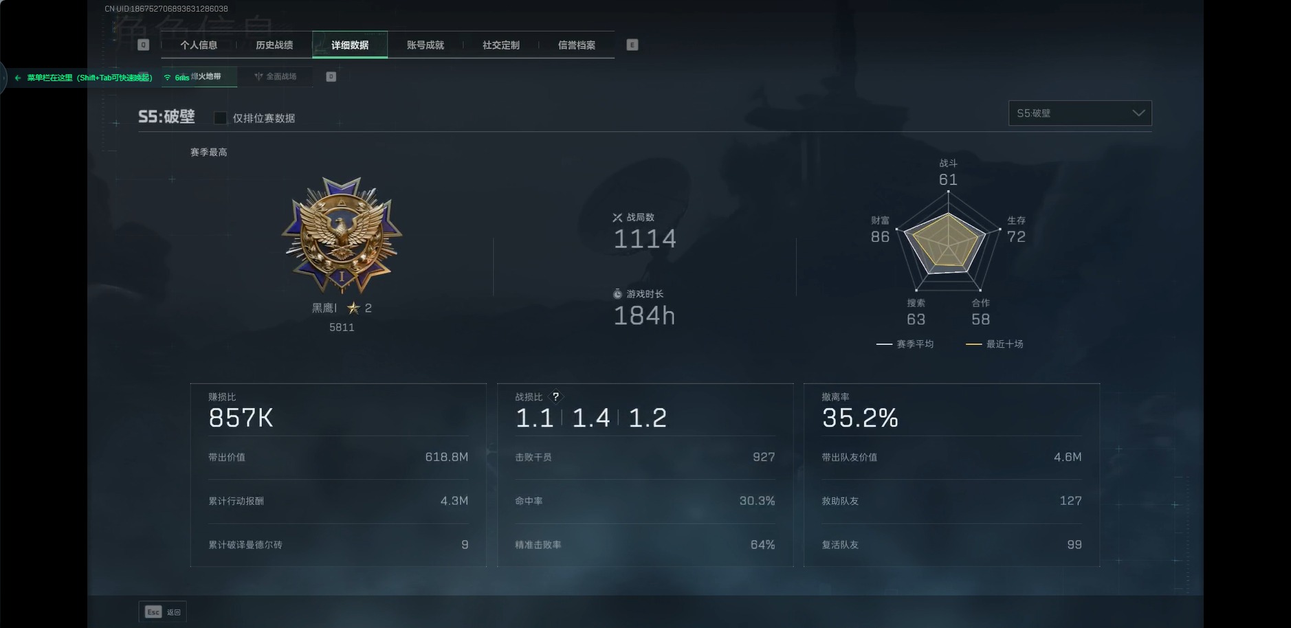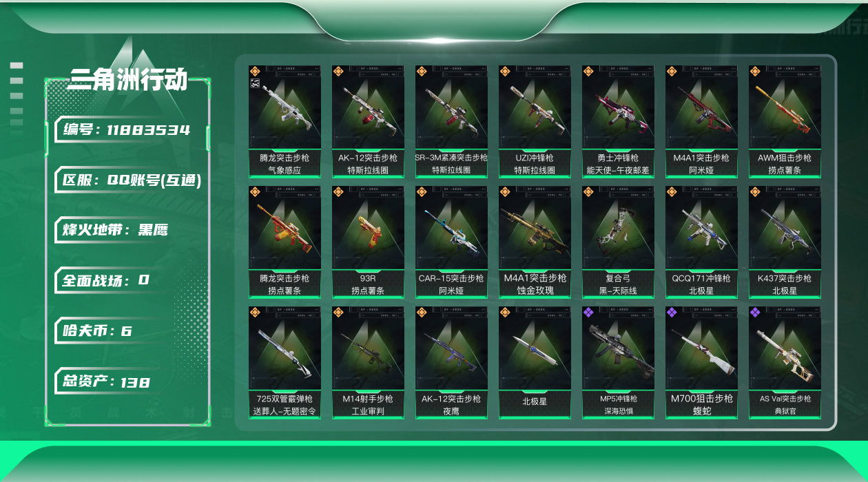 [11883534]总资产:138.3M 1干员外观 1近战传说 18传说枪械 哈夫币:6.782K 高级安全箱(2×3)9.15号到期 可二次 可修改实名 优质装备:近战-北极星,腾龙突击步枪-气象感应(典藏) 烽火地带段位:黑鹰 全面战场段位:军士长 传说武器皮肤:AK-12突击步枪-夜鹰,M4A1突击步枪-阿米娅,CAR-15突击步枪-阿米娅,复合弓-黑-天际线,AWM狙击步枪-捞点薯条,QCQ171冲锋枪-北极星,腾龙突击步枪-捞点薯条,93R-捞点薯条,AK-12突击步枪-特斯拉线圈,SR-3M紧凑突击步枪-特斯拉线圈,UZI冲锋枪-特斯拉线圈,勇士冲锋枪-能天使-午夜邮差,725双管霰弹枪-送葬人-无题密令,K437突击步枪-北极星,M14射手步枪-工业审判,M4A1突击步枪-蚀金玫瑰 史诗武器皮肤:勇士冲锋枪-私人定制(典藏),M700狙击步枪-蝮蛇,PKM通用机枪-蝮蛇,Ash-12战斗步枪-守夜人,M16A4突击步枪-竞赛选手,PKM通用机枪-守夜人,AS Val突击步枪-尖端治疗,M700狙击步枪-守夜人,SG552突击步枪-尖端治疗,SR-25射手步枪-尖端治疗,PKM通用机枪-荒野求生,MP5冲锋枪-深海恐惧,AKM突击步枪-林中猎手,SR-3M紧凑突击步枪-荒野求生,M1014霰弹枪-林中猎手,SV-98狙击步枪-林中猎手,PTR-32突击步枪-英雄,SVD狙击步枪-荒野求生,AS Val突击步枪-典狱官,M250通用机枪-囚徒,SV-98狙击步枪-囚徒,SCAR-H战斗步枪-囚徒,腾龙突击步枪-无垢,MP7冲锋枪-无垢,PSG-1射手步枪-无垢,SVD狙击步枪-阿萨拉工艺,S12K霰弹枪-曙光 干员外观:红狼-蚀金玫瑰