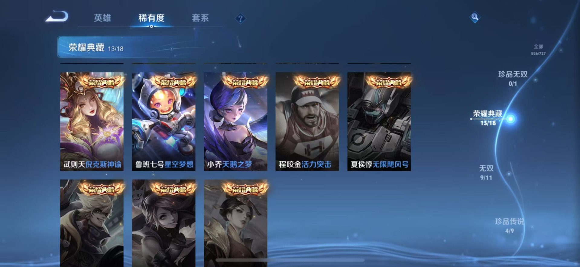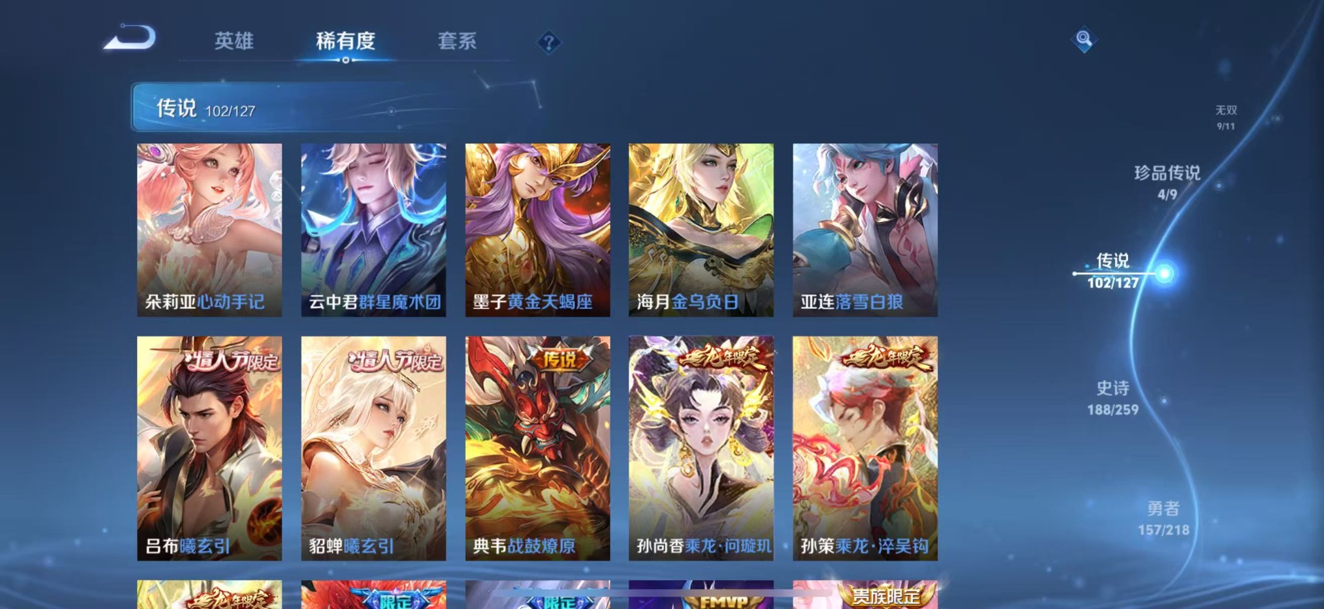 小乔天鹅之梦,诸葛亮星域神启,花木兰九霄神辉,韩信弑枪猎影,虞姬神鉴启示录,貂蝉幻阙歌,铠银白咏叹调,伽罗最初的交响,鲁班七号星空梦想,武则天倪克斯神谕,李白鸣剑·曳影,瑶拾光映像,关羽赤影疾锋