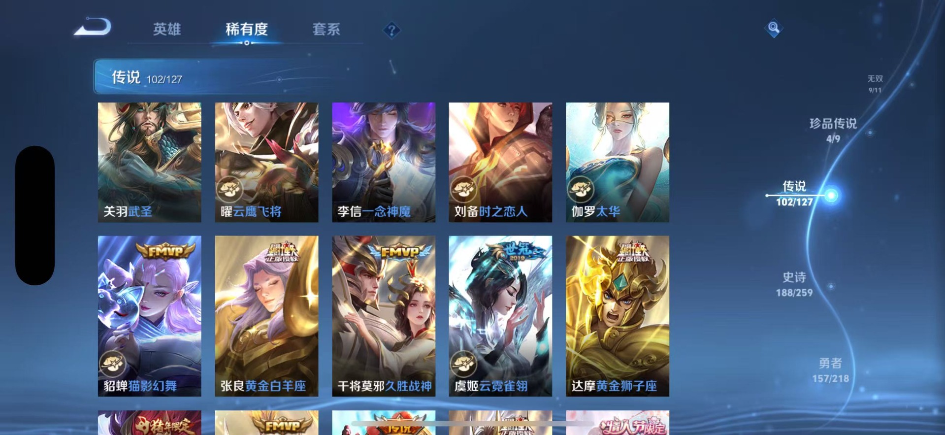 - PX_2102694-实名: 可修改 贵族等级: V7 英雄数: 123 皮肤数: 188 传说皮: 冠军飞将,炽阳神光,末日机甲-孙尚香,地狱火,地狱之眼,胖达荣荣,超时空战士-狄仁杰,山海·炽霜斩,山海·苍雷引,电玩·雷克斯 限定皮: 李小龙,引擎之心,白虎志,青龙志,瑞麟志,玄武志,朱雀志,一生所爱,大圣娶亲,五谷丰年,山海·玄木吟