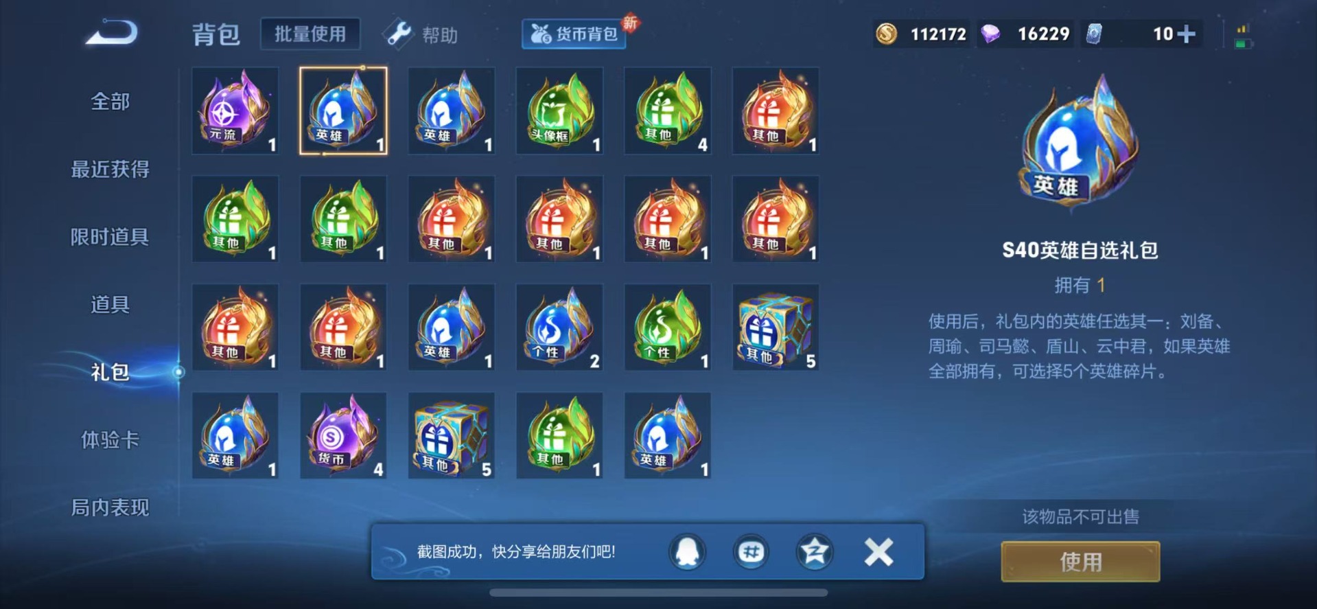 - [8956578]实名: 可修改 贵族等级: V7 英雄数: 123 皮肤数: 228 荣耀水晶: 无限飓风号 传说皮: 云鹰飞将,绛天战甲,一念神魔,无双飞将,幻光神枪 限定皮: 飞衡,青龙志,武陵仙君,如梦令-后羿,高山流水,孙行者,傲雪梅枪,百木心枪,五谷丰年,神器·万象笔,山海·玄木吟,鸣野蒿,愿照·山河定,愿照·岁时盈