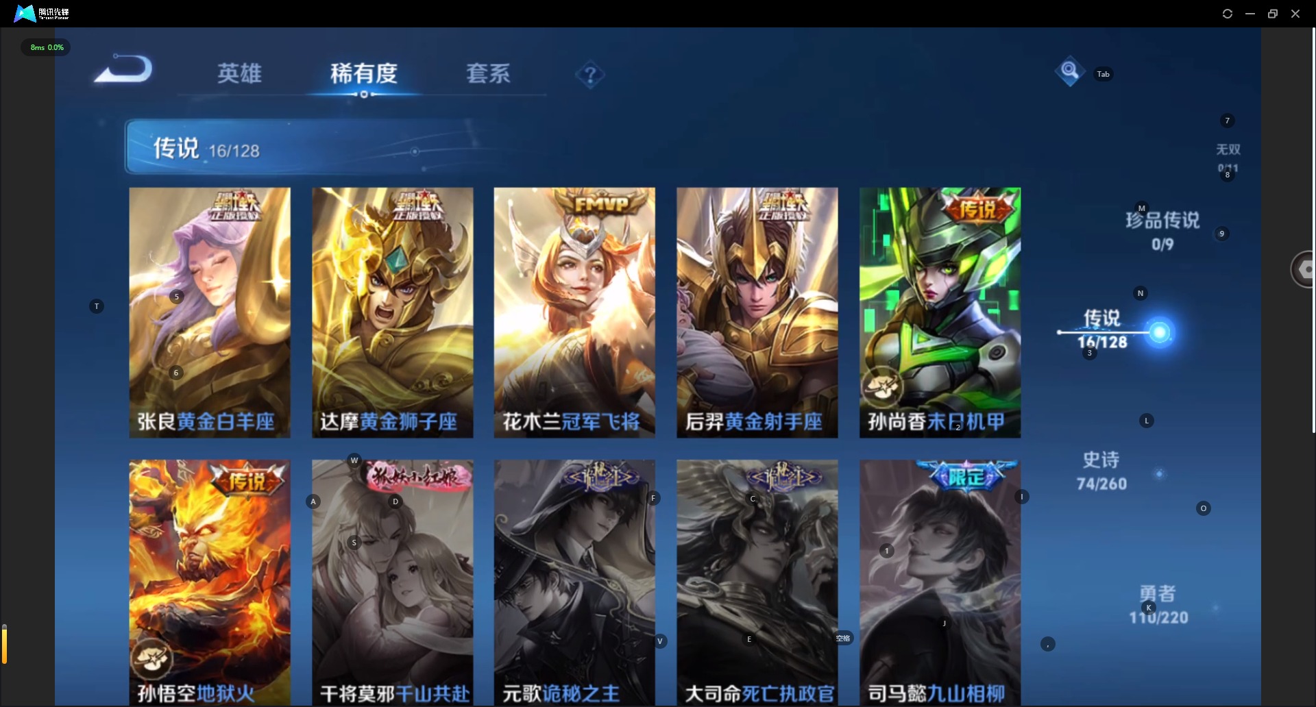 - [11472190]V9 1典藏 2珍品传说 23传说 126英雄 340皮肤 典藏英雄武则天 可修改实名 荣耀水晶:弑枪猎影(韩信典藏) 珍品传说:江户川柯南,时之奇旅-孙策 传说皮:铠冥王哈迪斯,幻光神枪,地狱火,仲夏夜之梦(大飞蛾),海洋之心,地狱之眼,一念神魔,云鹰飞将(小将军),无双飞将,乞巧织情,时之恋人-刘备(电焊工),超时空战士-狄仁杰 珍宝阁皮:妄想食味 限定皮:愿照·九州拓(澜年限),愿照·岁时盈(虞姬年限),愿照·山河定(司空震年限),愿照·众生和(妲己年限),愿照·千秋盛(女娲年限),逐霄战戟,陌上桑,鸣野蒿,夏侯惇霜北刀,至尊宝,白虎志(电光耗子),凤求凰(白切鸡),魔法小厨娘,飞衡(韩信年限),至美·乘鲤谣,天狼狩猎者,逐梦之星,岱宗(典韦年限),天狼溯光者,李小龙,辉光之辰,猪悟能,大圣娶亲,天魔缭乱,青春决赛季,冰霜恋舞曲,神奇女侠 史诗皮:星界战将,茶境仙,器灵·浮梦炉,龙之律动,石田雨龙,百相守梦-百里守约,百相守梦-黄忠,戍鼓铭心,东方月初,蒙犽顽岩魄,埋骨钱,海诺心动手记,百相守梦-周瑜,化蝶舞,破空之剑,紫霞仙子,苍穹之光,黄金分割率,特工魅影,千年之狐,永昼,冰冠公主,青蛇,偶像歌手,晚萤,魅语,末日机甲-吕布,猫狗日记-孙策,猫狗日记-大乔,时之恋人-孙尚香,乱世虎臣,节奏热浪,修罗,女仆咖啡,摇滚巨星,水果甜心,绅士熊喵,天才门将,星夜王子,心灵骇客,功夫厨神,德古拉伯爵,暗隐猎兽者,幽灵船长,鬼剑武藏,暗渊魔法,心灵战警,乐园奇幻夜,天秀·启明,舞动绿茵,地狱岩魂,纤云弄巧,缤纷独角兽,乘风破浪,逐浪之夏,水晶猎龙者,曙光守护者,箭羽风息,金属风暴,圣诞狂欢,圣诞恋歌,鹰眼统帅,暗夜贵公子,魅力维加斯,赏金猎手,未来纪元-赵云