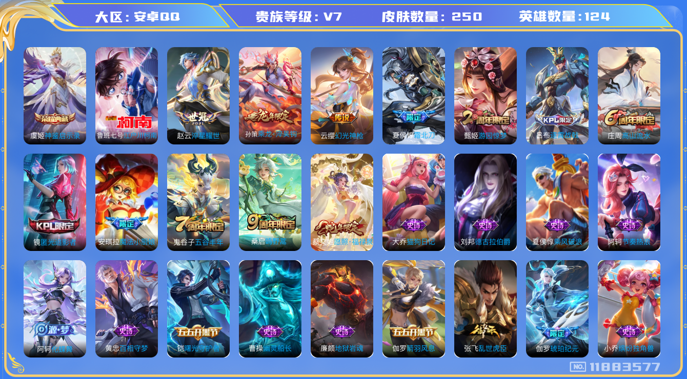 [11883577]V7 1典藏 1珍品传说 6传说 124英雄 250皮肤 可修改实名 女号 优质装备:神鉴启示录,江户川柯南,淬星耀世 传说皮:乘龙·淬吴钩(孙策年限),幻光神枪 珍宝阁皮:万物之道,蔷薇恋人,玩趣恶龙 限定皮:愿照·福禄聚(蔡文姬年限),逐霄战戟,鸣野蒿,夏侯惇霜北刀,魔法小厨娘,高山流水,五谷丰年,游园惊梦,匿光追影者 史诗皮:化蝶舞,星界战将,龙之律动,石田雨龙,破空之剑,蒙犽顽岩魄,芈月浮光幕影,琥珀纪元伽罗,蔬乡物语(鲁班七号),百相守梦-百里守约,百相守梦-黄忠,紫霞仙子,苍穹之光,特工魅影,江河有灵,雪夜绮愿(周瑜),百解令(蒙犽),蒙恬荣光圣徽,无限星赏官,冰冠公主,偶像歌手,电玩·爆裂旋风,龙骑士(小龙虾),末日机甲-吕布,猫狗日记-孙策,猫狗日记-大乔,时之恋人-孙尚香,乱世虎臣,节奏热浪,修罗,女仆咖啡,摇滚巨星,水果甜心,绅士熊喵,天才门将,星夜王子,心灵骇客,功夫厨神,德古拉伯爵,暗隐猎兽者,幽灵船长,鬼剑武藏,心灵战警,天秀·启明,舞动绿茵,地狱岩魂,拒霜思,缤纷独角兽,乘风破浪,逐浪之夏,水晶猎龙者,曙光守护者,箭羽风息,金属风暴,原初追逐者,圣诞狂欢,圣诞恋歌,鹰眼统帅,暗夜贵公子,魅力维加斯,黎明之约,无心