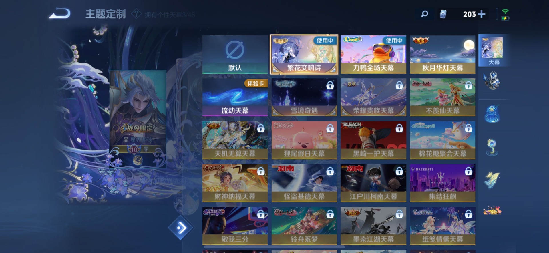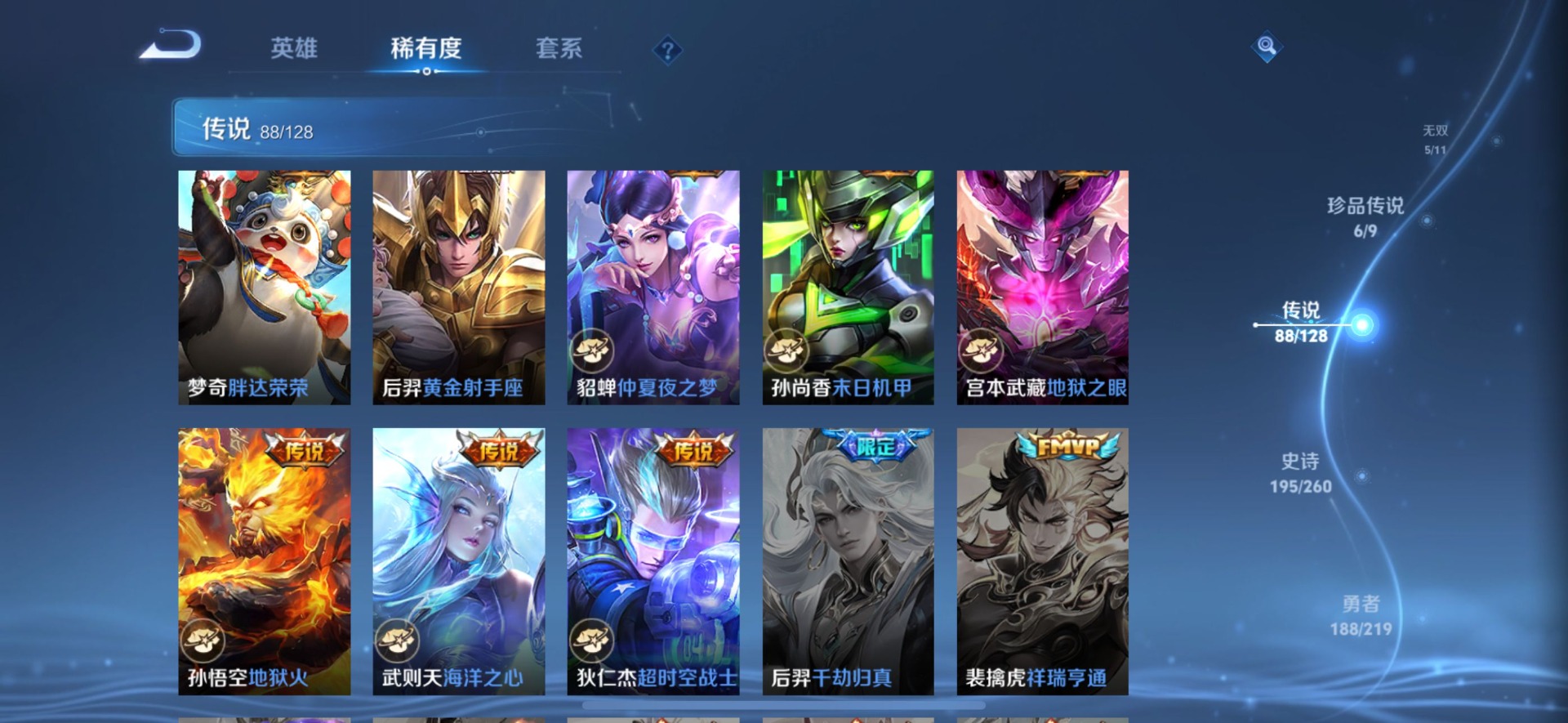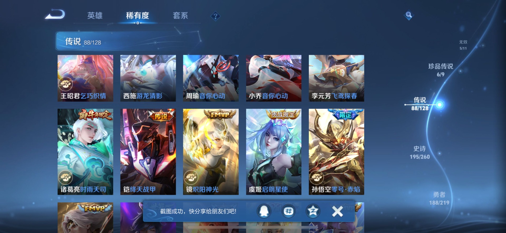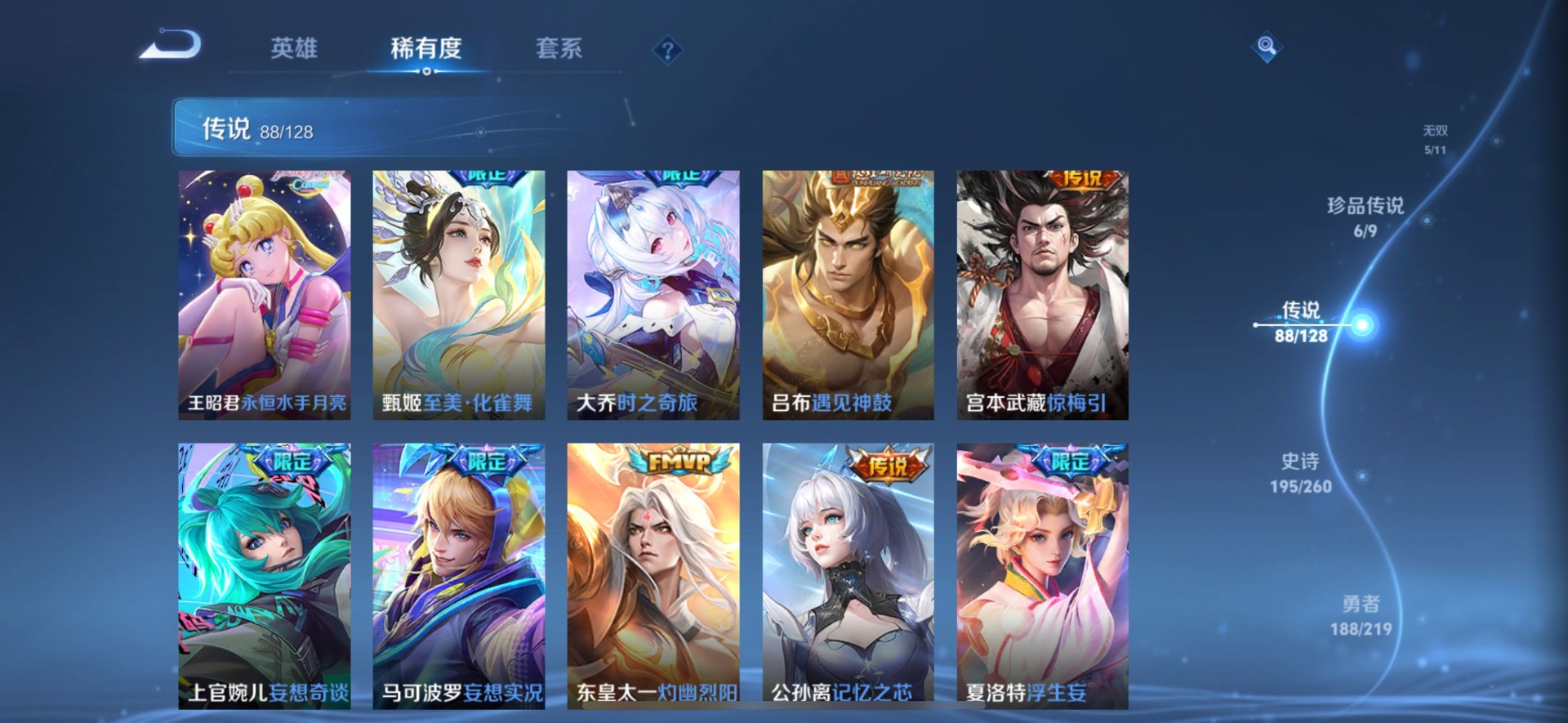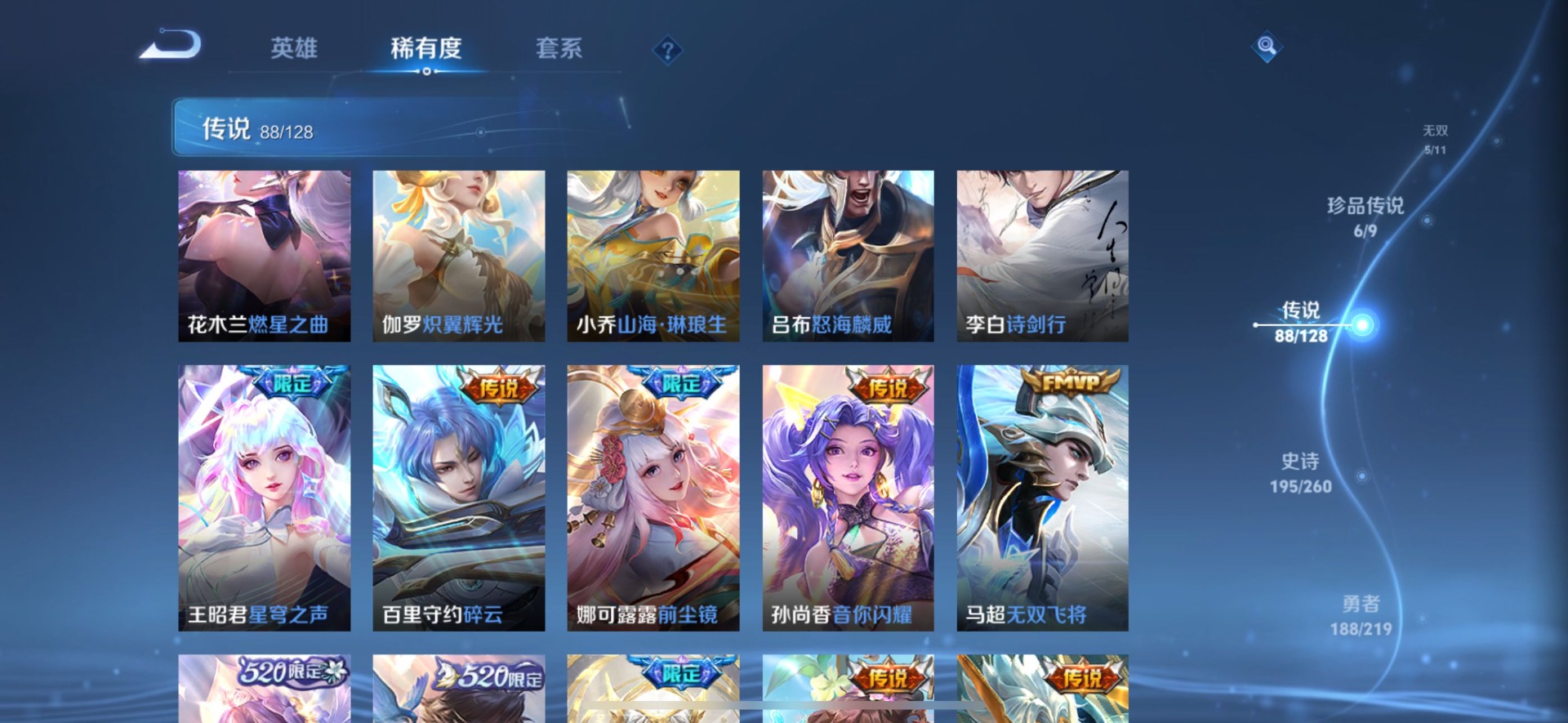 刘备时之恋人,小乔音你心动,李信一念神魔,孙尚香音你闪耀,露娜霜月吟,庄周牧神诗旅,镜炽阳神光,朵莉亚心动手记,周瑜音你心动,杨玉环星之鸣奏,宫本武藏惊梅引,貂蝉遇见胡旋,貂蝉猫影幻舞,张良黄金白羊座,孙悟空零号·赤焰,曜云鹰飞将,云中君群星魔术团,百里守约碎云,墨子黄金天蝎座,澜逐花归海,虞姬云霓雀翎,貂蝉曦玄引,王昭君永恒水手月亮,大乔挚爱花嫁,大乔时之奇旅,铠绛天战甲,铠冥王哈迪斯,孙膑小动物乐团,赵云淬星耀世,干将莫邪久胜战神,典韦战鼓燎原,孙策末日机甲,孙策挚爱之约,达摩黄金狮子座,海月金乌负日,王昭君乞巧织情,吕布遇见神鼓,公孙离记忆之芯,亚连落雪白狼,夏洛特浮生妄,艾琳觅芳踪,西施游龙清影,西施续相思,马超无双飞将,李元芳飞鸢探春,蔡文姬花朝如约,云缨幻光神枪