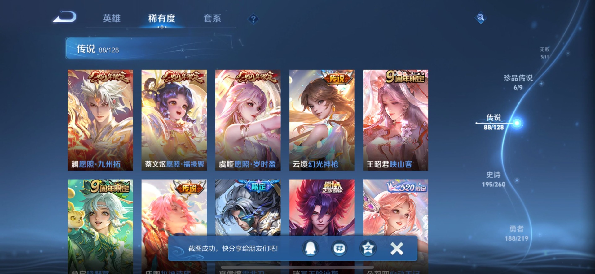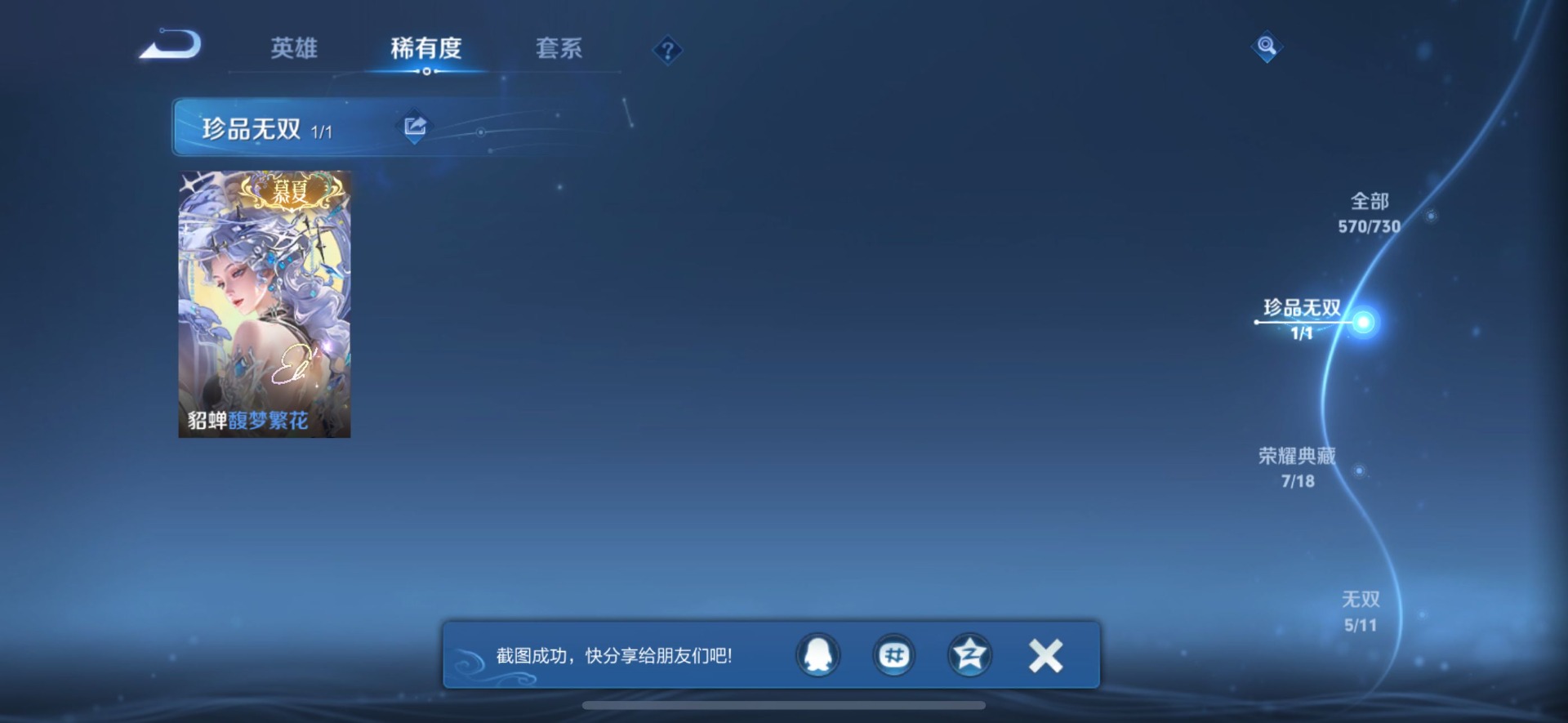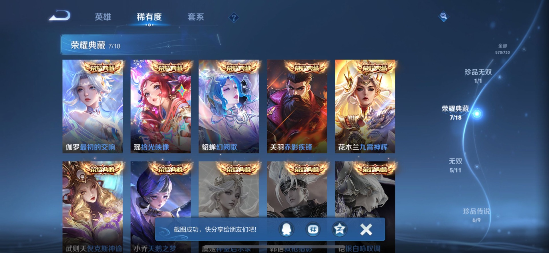 小乔天鹅之梦,花木兰九霄神辉,貂蝉幻阙歌,伽罗最初的交响,武则天倪克斯神谕,瑶拾光映像,关羽赤影疾锋