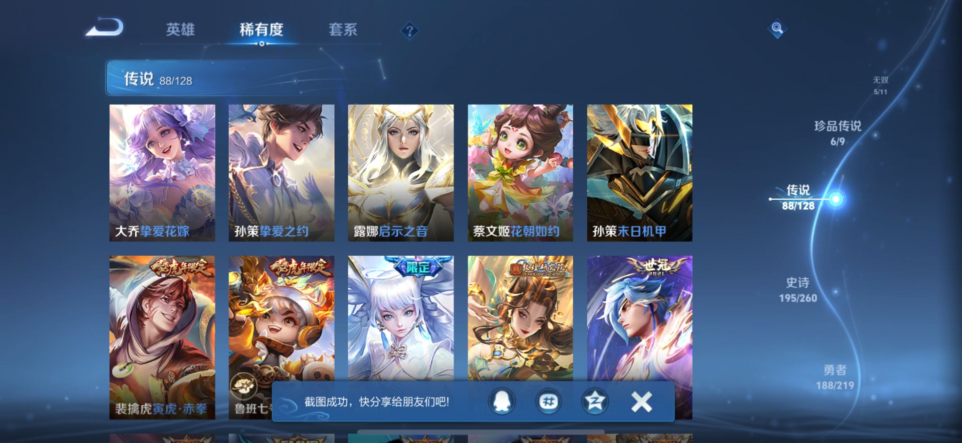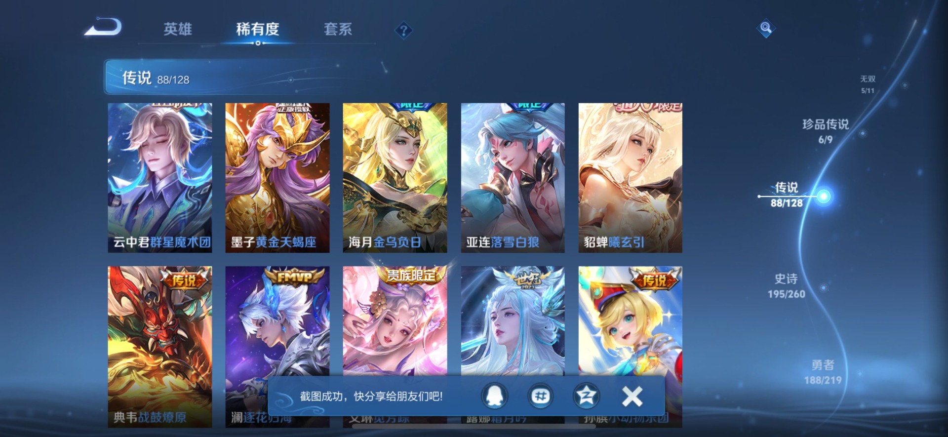 - [11472033]V8 1典藏 15传说 125英雄 314皮肤 可修改实名 荣耀水晶:全息碎影(猴子典藏) 传说皮:琥珀纪元铠,乘龙·铭钟鼎(赵云年限),祥瑞亨通,黄金射手座,地狱火,仲夏夜之梦(大飞蛾),地狱之眼,云鹰飞将(小将军),无双飞将,末日机甲-孙策,鹤羽星尊 珍宝阁皮:妄想食味,优雅恋人,蔷薇恋人 限定皮:鸣野蒿,至尊宝,凤求凰(白切鸡),遇见飞天,高山流水,怒海麟威,五谷丰年,梁祝,李小龙,孙行者,猪悟能 史诗皮:星界战将,龙之律动,蔬乡物语(鲁班七号),白龙吟,特工魅影,千年之狐,真我赫兹(百里守约),鹤归松栖(赵怀真),末日机甲-莱西奥,江河有灵,高渐离燃音魔法,蒙恬荣光圣徽,冰冠公主,偶像歌手,晚萤,电玩·爆裂旋风,暗夜猫娘,龙骑士(小龙虾),末日机甲-吕布,猫狗日记-孙策,乱世虎臣,节奏热浪,女仆咖啡,摇滚巨星,水果甜心,绅士熊喵,天才门将,星夜王子,心灵骇客,功夫厨神,德古拉伯爵,暗隐猎兽者,幽灵船长,心灵战警,舞动绿茵,地狱岩魂,纤云弄巧,缤纷独角兽,乘风破浪,逐浪之夏,月团寄思,水晶猎龙者,曙光守护者,金属风暴,原初追逐者,圣诞狂欢,圣诞恋歌,鹰眼统帅,王者之锤,暗夜贵公子,魅力维加斯,黎明之约,无心,未来纪元-赵云