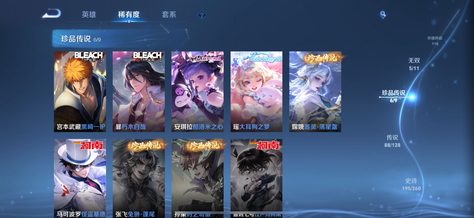 - PX_2104919-Q/绝世王者/291皮肤/125英雄/1典藏/0珍品无双/1无双/0珍品传说/19传说/82史诗/9稀有英雄 【1 典藏皮肤】鸣剑·曳影 李白, 【1 无双皮肤】碎月剑心 李白, 【19 传说皮肤】胖达荣荣 梦奇,启明星使 虞姬,云霓雀翎 虞姬,逐花归海 澜,白虎志 百里玄策,零号·赤焰 孙悟空,云鹰飞将 曜,游龙清影 西施,凤求凰 李白,猫影幻舞 貂蝉,记忆之芯 公孙离,炽