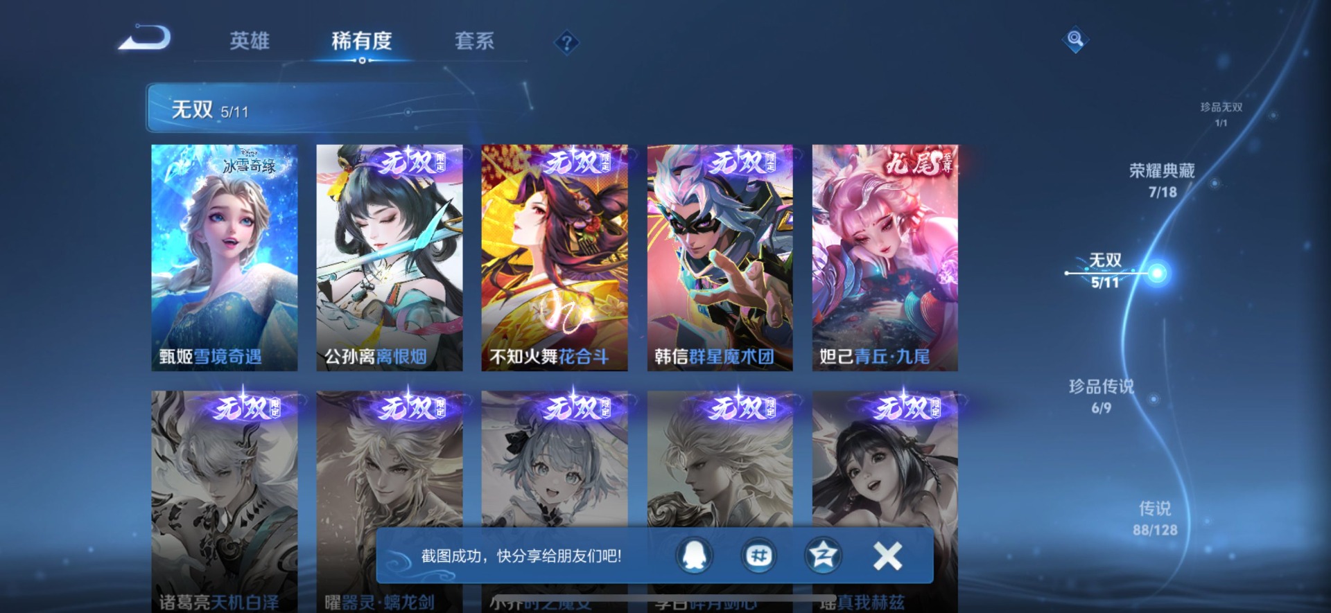夏侯惇霜北刀,孙尚香异界灵契,露娜启示之音,露娜一生所爱,诸葛亮时雨天司,杨玉环寅虎·心曲,司空震愿照·山河定,裴擒虎李小龙,裴擒虎寅虎·赤拳,东皇太一逐梦之光,上官婉儿梁祝,上官婉儿神器·万象笔,花木兰默契交锋,花木兰瑞麟志,马可波罗逐梦之星,猪八戒猪悟能,孙悟空孙行者,孙悟空大圣娶亲,孙悟空至尊宝,芈月白晶晶,韩信傲雪梅枪,百里守约朱雀志,墨子降魔,澜愿照·九州拓,虞姬霸王别姬,虞姬愿照·岁时盈,王昭君凤凰于飞,王昭君星穹之声,王昭君映山客,大乔白鹤梁神女,甄姬女儿国国王,甄姬至美·化雀舞,廉颇寅虎·御盾,伽罗天狼溯光者,伽罗太华,张飞虎魄,赵云百木心枪,孙膑寅虎·展翼,典韦岱宗,鲁班七号乒乒小将,鲁班七号寅虎·瑞焰,吕布御风骁将,公孙离蜜橘之夏,李白诗剑行,安琪拉魔法小厨娘,艾琳陌上桑,西施至美·乘鲤谣,桑启鸣野蒿,女娲愿照·千秋盛,马超神威,妲己时之彼端,妲己时之奇旅,妲己愿照·众生和,蔡文姬奇迹圣诞,蔡文姬愿照·福禄聚,瑶山海·碧波行,娜可露露前尘镜,妲己热情桑巴