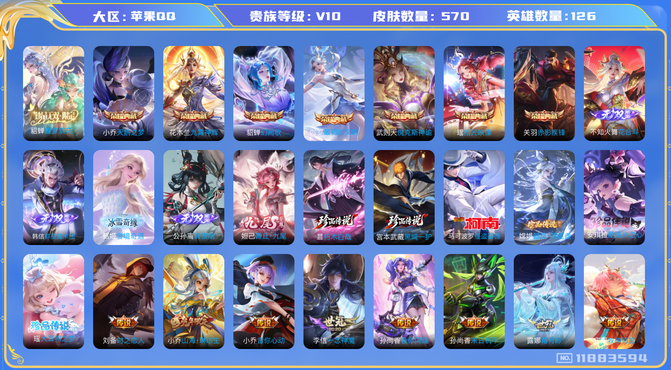 [11883594]V10 7典藏 1珍品无双 5无双 6珍品传说 88传说 126英雄 570皮肤 典藏英雄武则天 可修改实名 优质装备:馥梦繁花,天鹅之梦(小乔典藏),倪克斯神谕(宇宙婆娘),九霄神辉(木兰典藏),赤影疾锋,幻阙歌(貂蝉典藏),青丘·九尾(妲己无双),韩信群星魔术团(韩信无双),花合斗,离恨烟(公孙离无双),拾光映像(瑶典藏),雪境奇遇-甄姬,最初的交响(伽罗典藏),怪盗基德,器灵·落星盏,酷洛米之心,大耳狗之梦,朽木白哉,黑崎一护,黄金狮子座,黄金射手座,冠军飞将,云鹰飞将(小将军),绛天战甲(鸡嘴战神),黄金白羊座,猫影幻舞,久胜战神,炽阳神光,一念神魔,云霓雀翎,末日机甲-孙尚香(绿蚂蚱),地狱火,仲夏夜之梦(大飞蛾),音你心动-小乔,零号·赤焰,海洋之心,地狱之眼,飞鸢探春,音你心动-周瑜,胖达荣荣,乞巧织情,时之恋人-刘备(电焊工),游龙清影(小青龙),淬星耀世,超时空战士-狄仁杰,遇见胡旋,末日机甲-孙策,花朝如约(花篮子),挚爱之约,挚爱花嫁,无双飞将,音你闪耀(rap皮),碎云,天秀幻梦,山海·琳琅生(小乔年限),炽翼辉光(娃娃菜牛角包),燃星之曲,浮生妄,记忆之芯(机甲兔),青丘·九尾,灼幽烈阳,妄想实况,妄想奇谈,惊梅引,遇见神鼓,大乔-时之奇旅,永恒水手月亮,小动物乐团,霜月吟,澜逐花归海,艾琳觅芳踪,金乌负日,黄金天蝎座,云中君群星魔术团,朵莉亚心动手记,牧神诗旅,诡秘之主,千山共赴,涂山容容 传说皮:貂蝉曦玄引,典韦战鼓燎原,落雪白狼,死亡执政官,九山相柳,云诺千山,铠冥王哈迪斯,续相思,星之鸣奏,幻光神枪 珍宝阁皮:妄想食味,优雅恋人 限定皮:愿照·九州拓(澜年限),愿照·福禄聚(蔡文姬年限),愿照·岁时盈(虞姬年限),愿照·山河定(司空震年限),愿照·众生和(妲己年限),愿照·千秋盛(女娲年限),逐霄战戟,映山客,陌上桑,鸣野蒿,夏侯惇霜北刀,至尊宝,凤凰于飞,太华(伽罗年限),异界灵契(白毛香),傲雪梅枪,寅虎·展翼(孙膑年限),前尘镜,星穹之声,时之彼端,白鹤梁神女,魔法小厨娘,白晶晶,时雨天司(水龙头),神威(电光马子),山海·碧波行(瑶年限),瑞麟志(木兰年限),至美·乘鲤谣,至美·化雀舞,遇见飞天,高山流水,诗剑行,怒海麟威,降魔,五谷丰年,游园惊梦,梁祝,御风骁将(吕布年限),逐梦之星,岱宗(典韦年限),天狼溯光者,虎