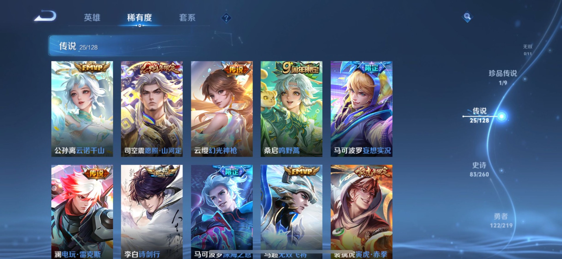 - PX_2106540- 可二次 V8 贵族积分62390 安卓QQ/295皮肤/125英雄/2典藏/0珍品无双/0无双/1珍品传说/15传说/86史诗/9稀有英雄 中路31段 打野36段 【1 星传说皮肤】,金色仲夏夜 貂蝉, 【1 珍品传说】,器灵·落星盏 嫦娥, 【2 典藏皮肤】,鸣剑·曳影 李白,银白咏叹调 铠, 【15 传说皮肤】,胖达荣荣 梦奇,星穹之声 王昭君,启明星使 虞姬,白虎志