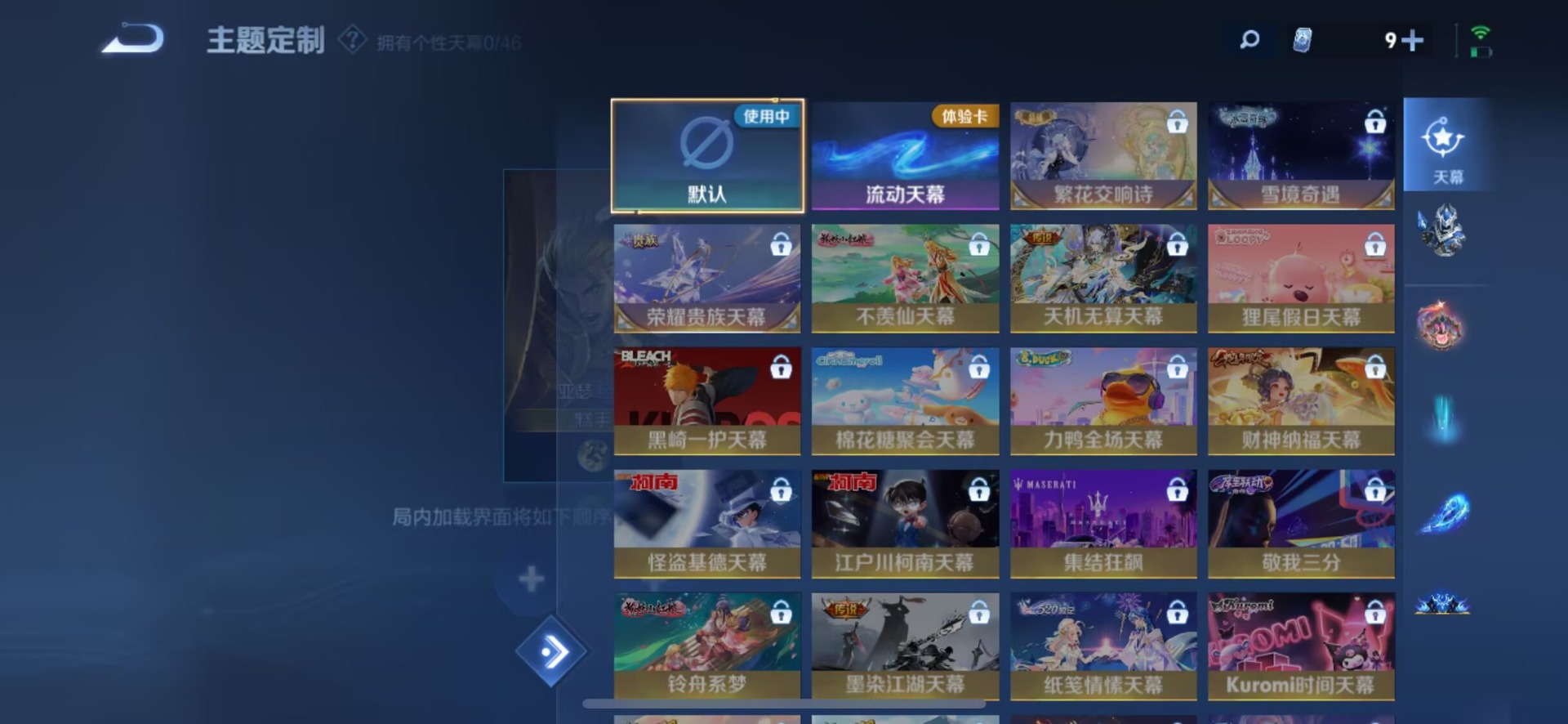 刘邦德古拉伯爵,夏侯惇乘风破浪,阿轲节奏热浪,铠曙光守护者,小乔缤纷独角兽,孙策猫狗日记,不知火舞魅语,赵怀真器灵·浮梦炉,鲁班七号电玩小子,项羽苍穹之光,吕布圣诞狂欢,吕布末日机甲,露娜紫霞仙子,镜真我赫兹,诸葛亮黄金分割率,刘禅天才门将,宫本武藏鬼剑武藏,兰陵王暗隐猎兽者,花木兰水晶猎龙者,李白千年之狐,安琪拉心灵骇客,蒙犽百解令,亚瑟心灵战警,嬴政暗夜贵公子,程咬金功夫厨神,百里玄策原初追逐者,雅典娜冰冠公主,雅典娜黎明之约,李元芳逐浪之夏,百里守约特工魅影,墨子金属风暴,蔡文姬舞动绿茵,娜可露露晚萤,王昭君偶像歌手,嫦娥拒霜思,橘右京修罗