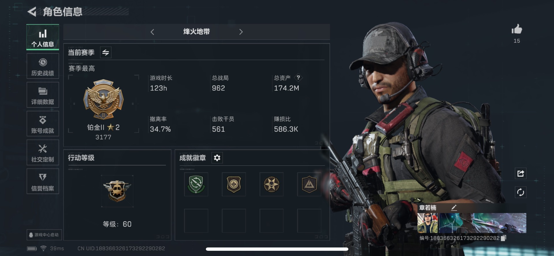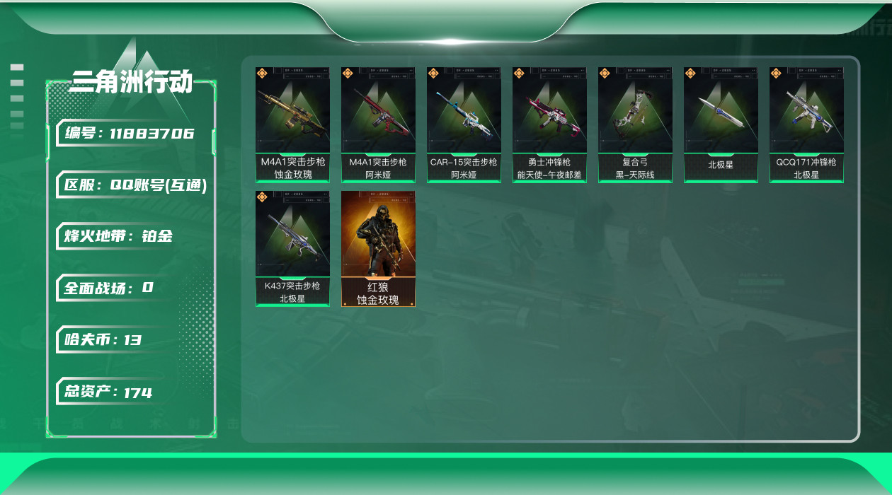 [11883706]总资产:174.2M 1干员外观 1近战传说 8传说枪械 哈夫币:13.460K 可二次 可修改实名 优质装备:近战-北极星 烽火地带段位:铂金 全面战场段位:无段位 传说武器皮肤:勇士冲锋枪-能天使-午夜邮差,复合弓-黑-天际线,K437突击步枪-北极星,QCQ171冲锋枪-北极星,M4A1突击步枪-阿米娅,CAR-15突击步枪-阿米娅,M4A1突击步枪-蚀金玫瑰 干员外观:红狼-蚀金玫瑰