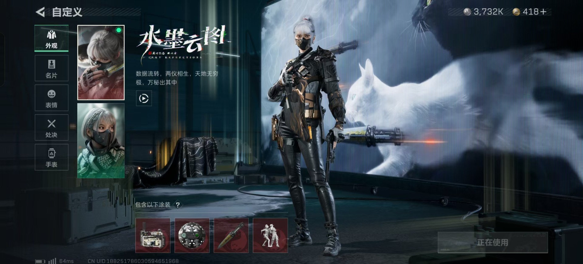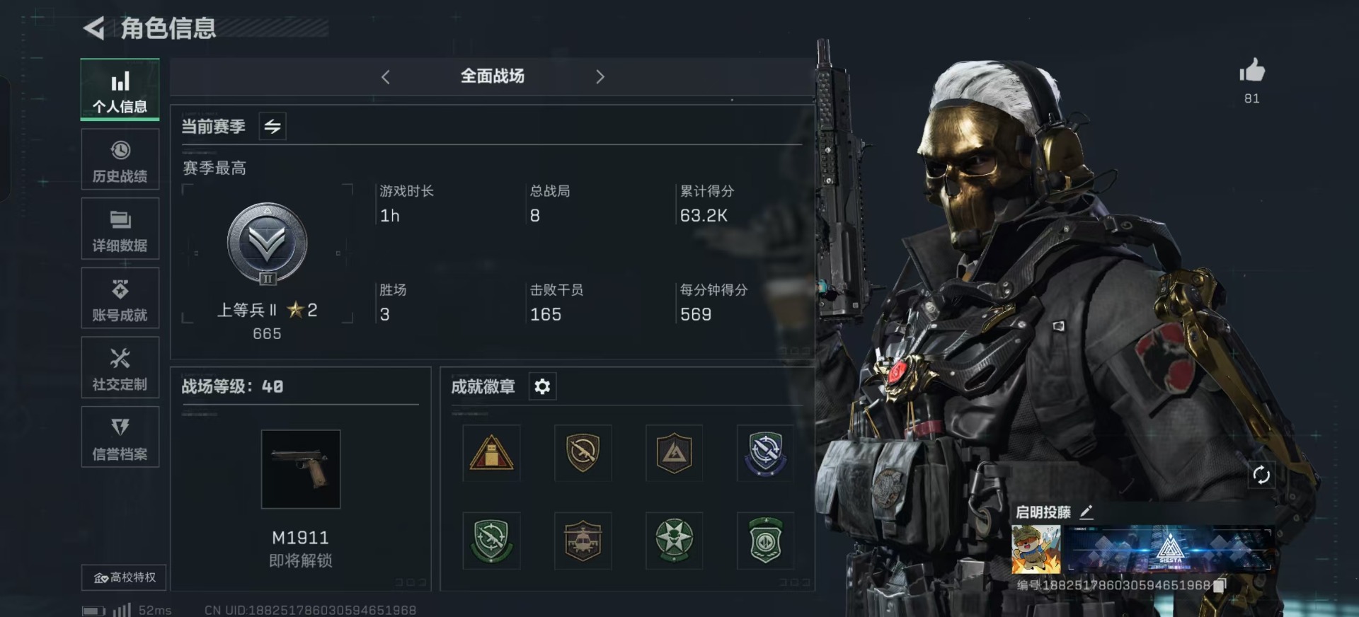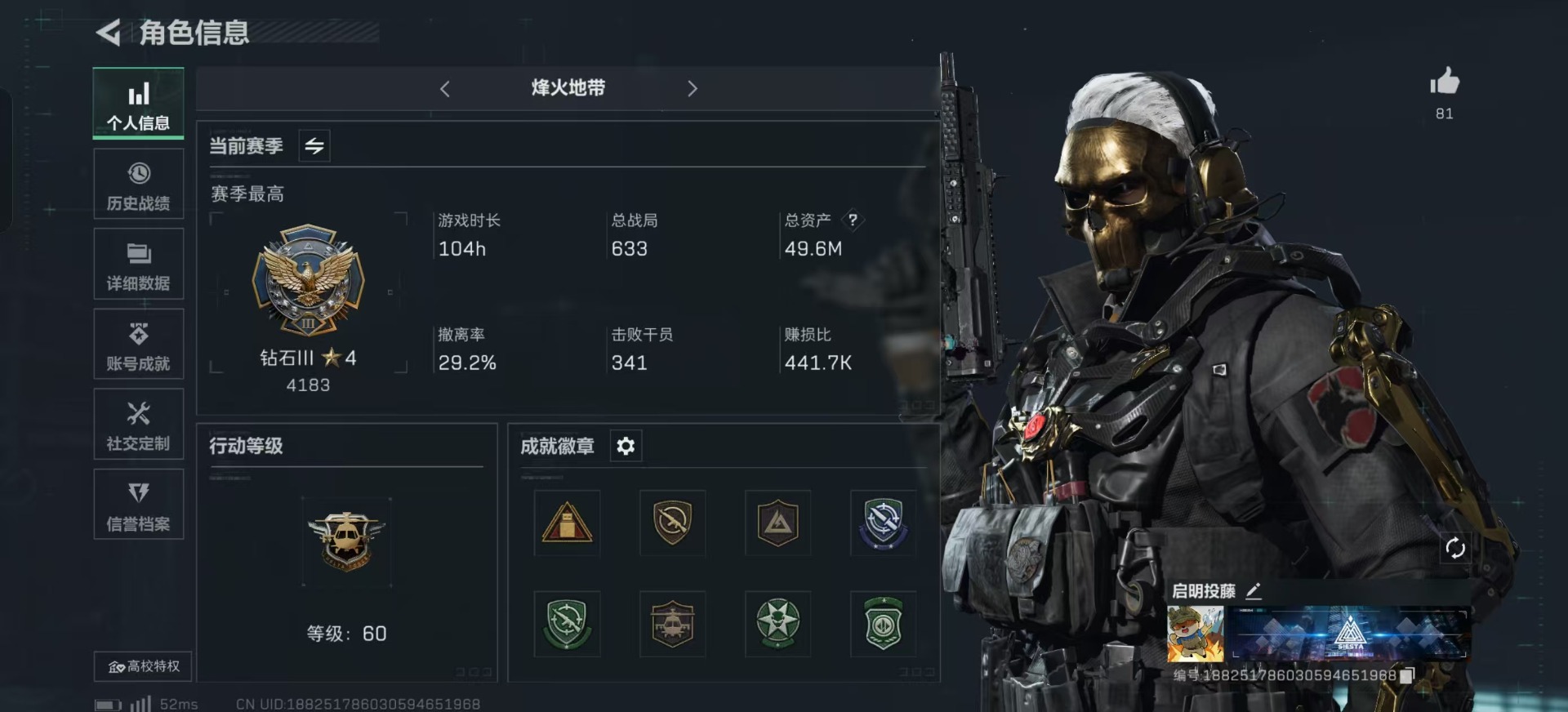 [11883756]总资产:49.6M 5干员外观 2近战传说 26传说枪械 哈夫币:3.732K 高级安全箱(9.17到期) 可二次 可修改实名 优质装备:近战-影锋,近战-北极星,K416突击步枪-命运(典藏),QBZ95-1突击步枪-王牌之剑(典藏) 烽火地带段位:钻石 全面战场段位:上等兵 传说武器皮肤:QJB201轻机枪-风林火山,SR-25射手步枪-水墨云图,SCAR-H战斗步枪-水墨云图,M1014霰弹枪-影锋,AWM狙击步枪-影锋,SCAR-H战斗步枪-铁艺苍穹,AK-12突击步枪-夜鹰,G18-飞虎,M16A4突击步枪-狩猎时刻,M4A1突击步枪-阿米娅,CAR-15突击步枪-阿米娅,复合弓-黑-天际线,Vector冲锋枪-狩猎时刻,G3战斗步枪-狩猎时刻,QCQ171冲锋枪-北极星,勇士冲锋枪-能天使-午夜邮差,725双管霰弹枪-送葬人-无题密令,K437突击步枪-北极星,M4A1突击步枪-蚀金玫瑰,QBZ95-1突击步枪-破军,CAR-15突击步枪-黑鹰坠落,Vector冲锋枪-能天使-午夜邮差 史诗武器皮肤:K416突击步枪-暗鸦,SR-3M紧凑突击步枪-英雄,QBZ95-1突击步枪-ACE,M4A1突击步枪-特勤执行,AUG突击步枪-特勤执行,Vector冲锋枪-红色彗星,PTR-32战斗步枪-ACE,PKM通用机枪-蝮蛇,G3战斗步枪-战场英杰,M16A4突击步枪-竞赛选手,AS Val突击步枪-尖端治疗,SG552突击步枪-尖端治疗,PKM通用机枪-荒野求生,MP5冲锋枪-深海恐惧,勇士冲锋枪-深海恐惧,SG552突击步枪-深海恐惧,AKM突击步枪-林中猎手,M1014霰弹枪-林中猎手,PTR-32突击步枪-英雄,AS Val突击步枪-典狱官,M250通用机枪-囚徒,SCAR-H战斗步枪-囚徒,MP7冲锋枪-无垢,QBZ95-1突击步枪-曙光,SCAR-H战斗步枪-国风,S12K霰弹枪-曙光,PKM通用机枪-英雄,PKM通用机枪-魔药,AUG突击步枪-战术迷彩 干员外观:威龙-铁面判官,红狼-蚀金玫瑰,骇爪-水墨云图,威龙-飞虎,露娜-黑·天际线