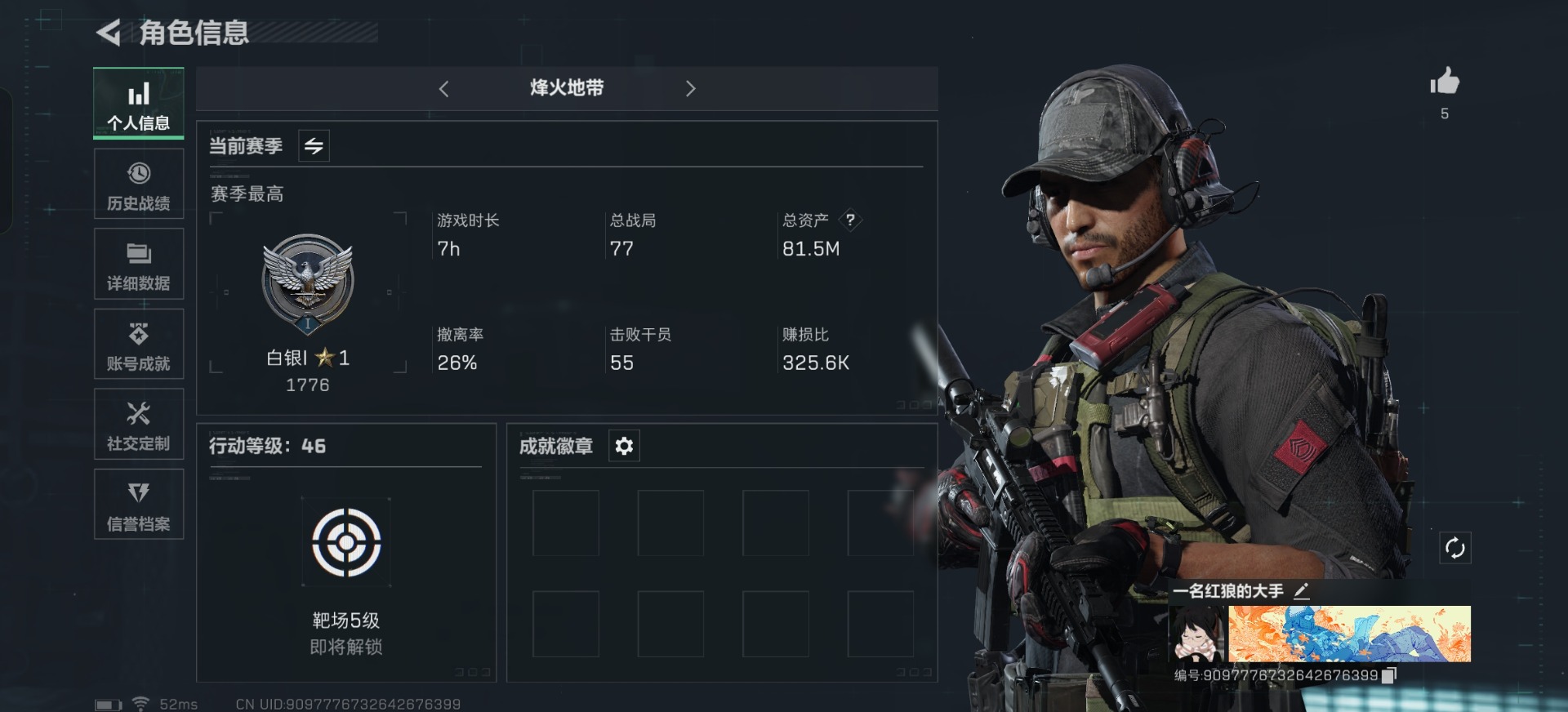 [11883784]总资产:81.5M 5传说枪械 哈夫币:42.332K 可二次 可修改实名 烽火地带段位:白银 全面战场段位:无段位 传说武器皮肤:AK-12突击步枪-特斯拉线圈,SR-3M紧凑突击步枪-特斯拉线圈,UZI冲锋枪-特斯拉线圈,勇士冲锋枪-能天使-午夜邮差,Vector冲锋枪-能天使-午夜邮差 史诗武器皮肤:PKM通用机枪-蝮蛇,M1014霰弹枪-林中猎手,PTR-32突击步枪-英雄,SV-98狙击步枪-囚徒,SVD狙击步枪-阿萨拉工艺