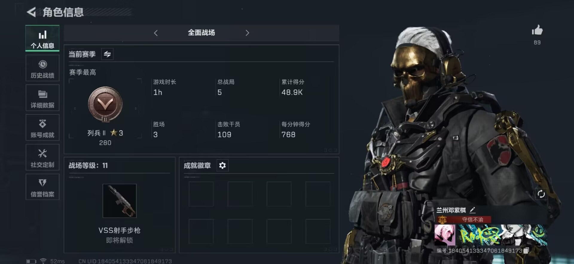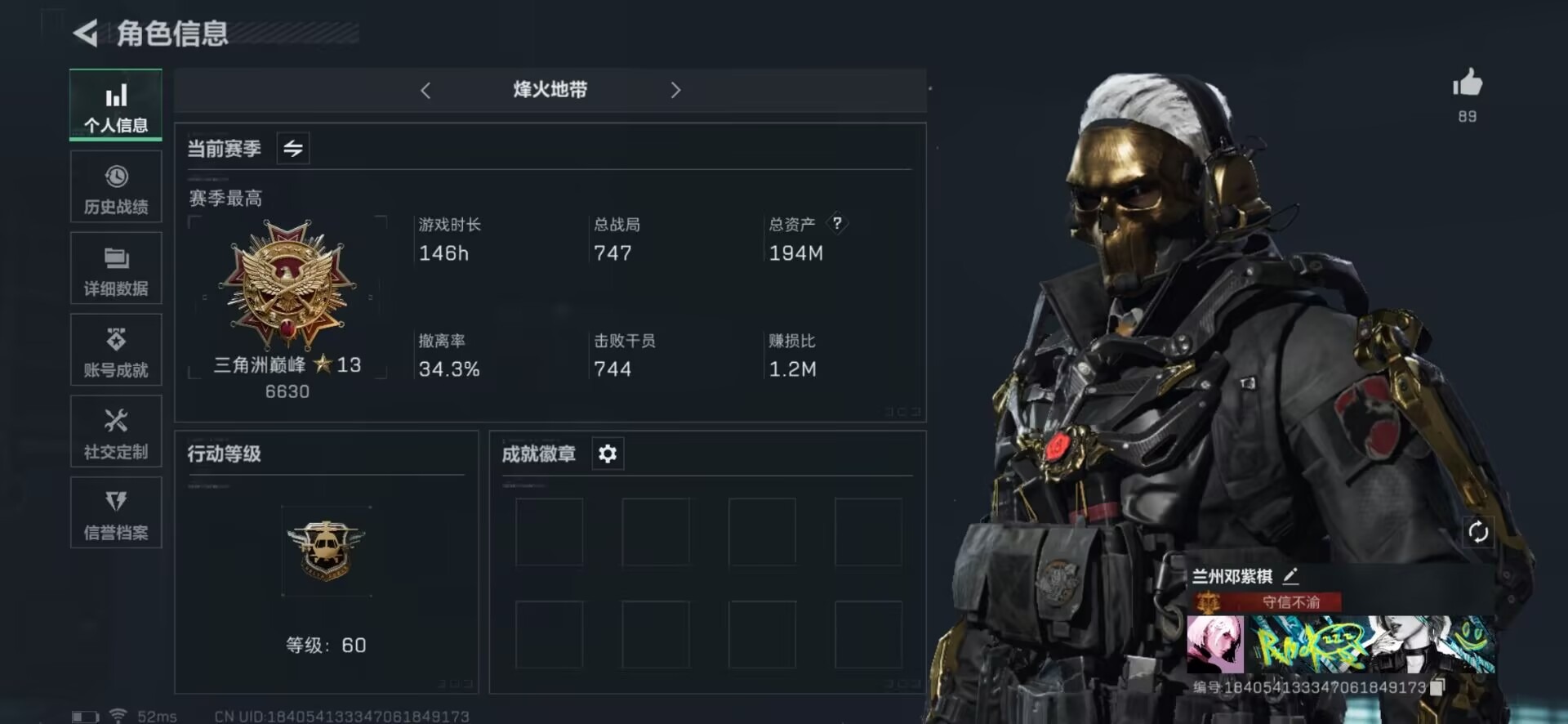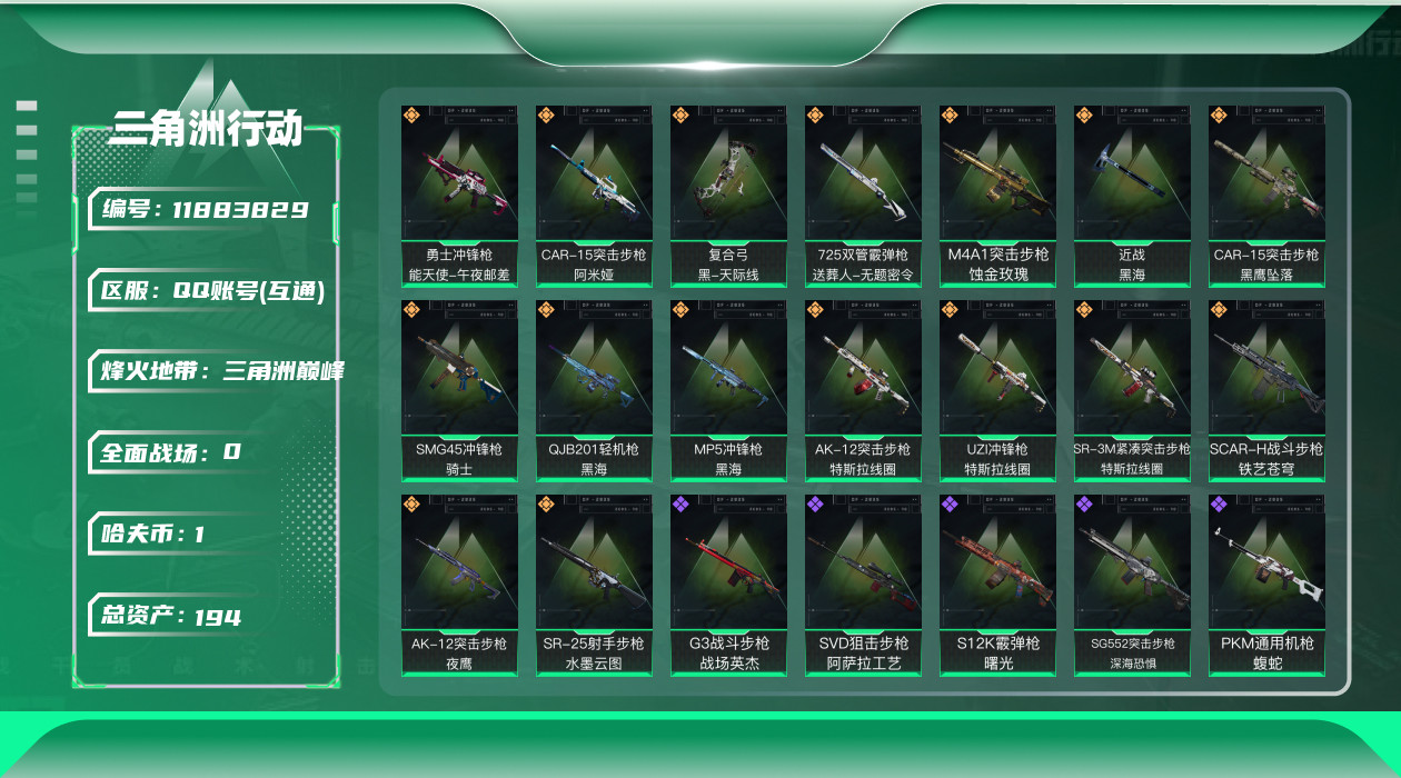 [11883829]总资产:194M 1干员外观 1近战传说 16传说枪械 哈夫币:1.682K 可二次 可修改实名 优质装备:近战-黑海,顶级安全箱(3x3) 烽火地带段位:三角洲巅峰 全面战场段位:列兵 传说武器皮肤:SR-25射手步枪-水墨云图,SCAR-H战斗步枪-铁艺苍穹,AK-12突击步枪-夜鹰,SMG45冲锋枪-骑士,CAR-15突击步枪-阿米娅,复合弓-黑-天际线,AK-12突击步枪-特斯拉线圈,SR-3M紧凑突击步枪-特斯拉线圈,UZI冲锋枪-特斯拉线圈,勇士冲锋枪-能天使-午夜邮差,725双管霰弹枪-送葬人-无题密令,MP5冲锋枪-黑海,QJB201轻机枪-黑海,M4A1突击步枪-蚀金玫瑰,CAR-15突击步枪-黑鹰坠落 史诗武器皮肤:QBZ95-1突击步枪-ACE,M4A1突击步枪-特勤执行,AUG突击步枪-特勤执行,Vector冲锋枪-红色彗星,PTR-32战斗步枪-ACE,SKS射手步枪-ACE,M700狙击步枪-蝮蛇,PKM通用机枪-蝮蛇,G3战斗步枪-战场英杰,Ash-12战斗步枪-守夜人,SVD狙击步枪-暗夜猎手,M16A4突击步枪-竞赛选手,PKM通用机枪-守夜人,AS Val突击步枪-尖端治疗,M700狙击步枪-守夜人,SG552突击步枪-尖端治疗,SR-25射手步枪-尖端治疗,PKM通用机枪-荒野求生,MP5冲锋枪-深海恐惧,SG552突击步枪-深海恐惧,AKM突击步枪-林中猎手,SR-3M紧凑突击步枪-荒野求生,M1014霰弹枪-林中猎手,PTR-32突击步枪-英雄,SVD狙击步枪-荒野求生,AS Val突击步枪-典狱官,M250通用机枪-囚徒,SV-98狙击步枪-囚徒,SCAR-H战斗步枪-囚徒,腾龙突击步枪-无垢,MP7冲锋枪-无垢,PSG-1射手步枪-无垢,M14射手步枪-黑鹰坠落,QBZ95-1突击步枪-曙光,沙漠之鹰-曙光,Vector冲锋枪-阿萨拉文明,SVD狙击步枪-阿萨拉工艺,S12K霰弹枪-曙光 干员外观:红狼-蚀金玫瑰