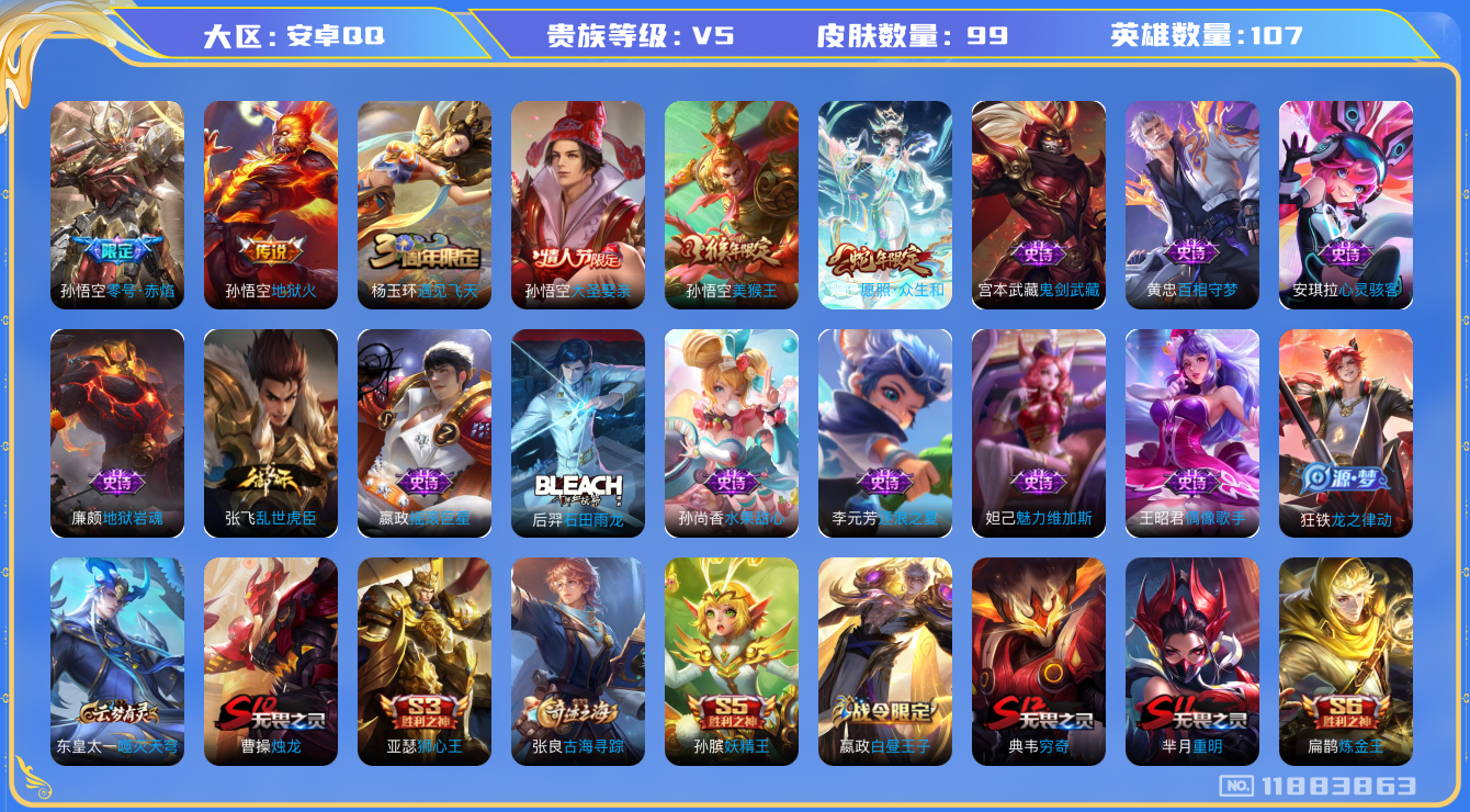- [12024642]V7 2典藏 1无双 3珍品传说 8传说 124英雄 244皮肤 可修改实名 优质装备:鸣剑·曳影,星域神启(倪克斯贼亮),器灵·螭龙剑,怪盗基德,器灵·落星盏,黄金白羊座,炽阳神光 珍品传说:时之奇旅-孙策 传说皮:续相思,幻光神枪 珍宝阁皮:胡桃夹子,万物之道,蔷薇恋人 限定皮:愿照·九州拓(澜年限),愿照·山河定(司空震年限),逐霄战戟,鸣野蒿,傲雪梅枪,遇见飞天,高山流水,五谷丰年,祈雪灵祝(雪兔子),李小龙,山海·玄木吟(马可年限) 史诗皮:鸭鸭历险记-刘禅,器灵·浮梦炉,糖绘人间,瑰影绮梦,化蝶舞,星界战将,龙之律动,百相守梦-周瑜,茶境仙,破空之剑,东方月初,蒙犽顽岩魄,埋骨钱,曹操夜都魔契,百相守梦-百里守约,百相守梦-黄忠,织梦人,紫霞仙子,特工魅影,千年之狐,永昼,江河有灵,魅语,蒙恬荣光圣徽,无限星赏官,白蛇,电玩·爆裂旋风,猫狗日记-孙策,时之恋人-孙尚香,摇滚巨星,水果甜心,天才门将,星夜王子,心灵骇客,功夫厨神,鬼剑武藏,心灵战警,舞动绿茵,地狱岩魂,纤云弄巧,拒霜思,乘风破浪,逐浪之夏,曙光守护者,金属风暴,圣诞恋歌,鹰眼统帅,暗夜贵公子,魅力维加斯,赏金猎手,无心,未来纪元-赵云,玫瑰异探