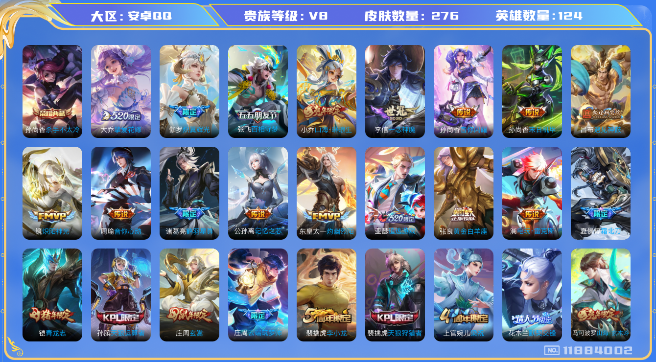 [11884002]V8 1典藏 19传说 124英雄 276皮肤 可修改实名 优质装备:杀手不太冷,黄金白羊座,炽阳神光,一念神魔,末日机甲-孙尚香(绿蚂蚱),音你心动-周瑜,挚爱花嫁,音你闪耀(rap皮),山海·琳琅生(小乔年限),炽翼辉光(娃娃菜牛角包),记忆之芯(机甲兔),百相守梦(张飞),追逃游戏(亚瑟),电玩·雷克斯,鹤羽星尊,灼幽烈阳,遇见神鼓 珍宝阁皮:妄想食味,胡桃夹子 限定皮:鸣野蒿,夏侯惇霜北刀,至尊宝,飞衡(韩信年限),玄嵩(庄周年限),山海·碧波行(瑶年限),五谷丰年,青龙志(铠年限),天狼运算者,梁祝,天狼狩猎者,李小龙,霸王别姬-虞姬,默契交锋-花木兰,大圣娶亲,引擎之心,云端筑梦师,美猴王,时之祈愿-云中君,山海·玄木吟(马可年限) 史诗皮:破空之剑,涂山红红,蒙犽顽岩魄,夜落电台,奇遇星旅,紫霞仙子,特工魅影,千年之狐,江河有灵,魅语,匿光破解者,青蛇,偶像歌手,晚萤,龙骑士(小龙虾),末日机甲-吕布,猫狗日记-孙策,时之恋人-孙尚香,乱世虎臣,节奏热浪,修罗,摇滚巨星,水果甜心,天才门将,星夜王子,心灵骇客,德古拉伯爵,暗隐猎兽者,鬼剑武藏,心灵战警,舞动绿茵,地狱岩魂,纤云弄巧,繁星吟游(呼啦呼啦),缤纷独角兽,乘风破浪,逐浪之夏,曙光守护者,热力回旋,金属风暴,圣诞狂欢,圣诞恋歌,鹰眼统帅,魅力维加斯,滕王阁序,无心