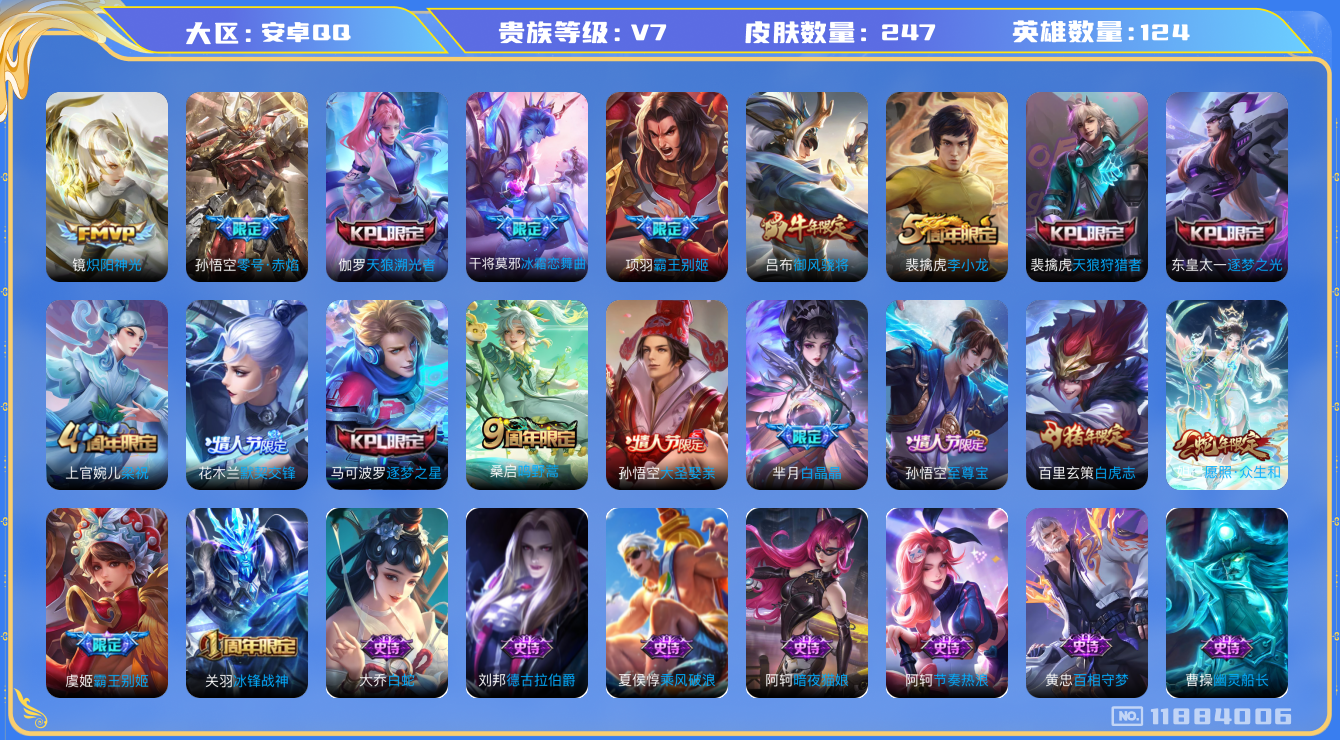 [11884006]V7 5传说 124英雄 247皮肤 可修改实名 优质装备:炽阳神光,零号·赤焰,涂山容容 珍宝阁皮:优雅恋人,蔷薇恋人 限定皮:愿照·众生和(妲己年限),鸣野蒿,至尊宝,白虎志(电光耗子),白晶晶,冰锋战神,梁祝,御风骁将(吕布年限),天狼狩猎者,逐梦之星,天狼溯光者,李小龙,逐梦之光,霸王别姬-项羽,霸王别姬-虞姬,默契交锋-花木兰,大圣娶亲,冰霜恋舞曲 史诗皮:鸭鸭历险记-刘禅,星界战将,百相守梦-周瑜,茶境仙,破空之剑,蔬乡物语(鲁班七号),百相守梦-百里守约,百相守梦-黄忠,紫霞仙子,苍穹之光,电玩小子(小书包),黄金分割率,特工魅影,千年之狐,冰冠公主,偶像歌手,白蛇,晚萤,暗夜猫娘,猫狗日记-孙策,时之恋人-孙尚香,乱世虎臣,节奏热浪,修罗,女仆咖啡,天才门将,星夜王子,心灵骇客,功夫厨神,德古拉伯爵,暗隐猎兽者,幽灵船长,鬼剑武藏,心灵战警,乐园奇幻夜,地狱岩魂,诗语江南,纤云弄巧,繁星吟游(呼啦呼啦),缤纷独角兽,乘风破浪,逐浪之夏,鹰眼统帅,暗夜贵公子,魅力维加斯,黎明之约,未来纪元-赵云
