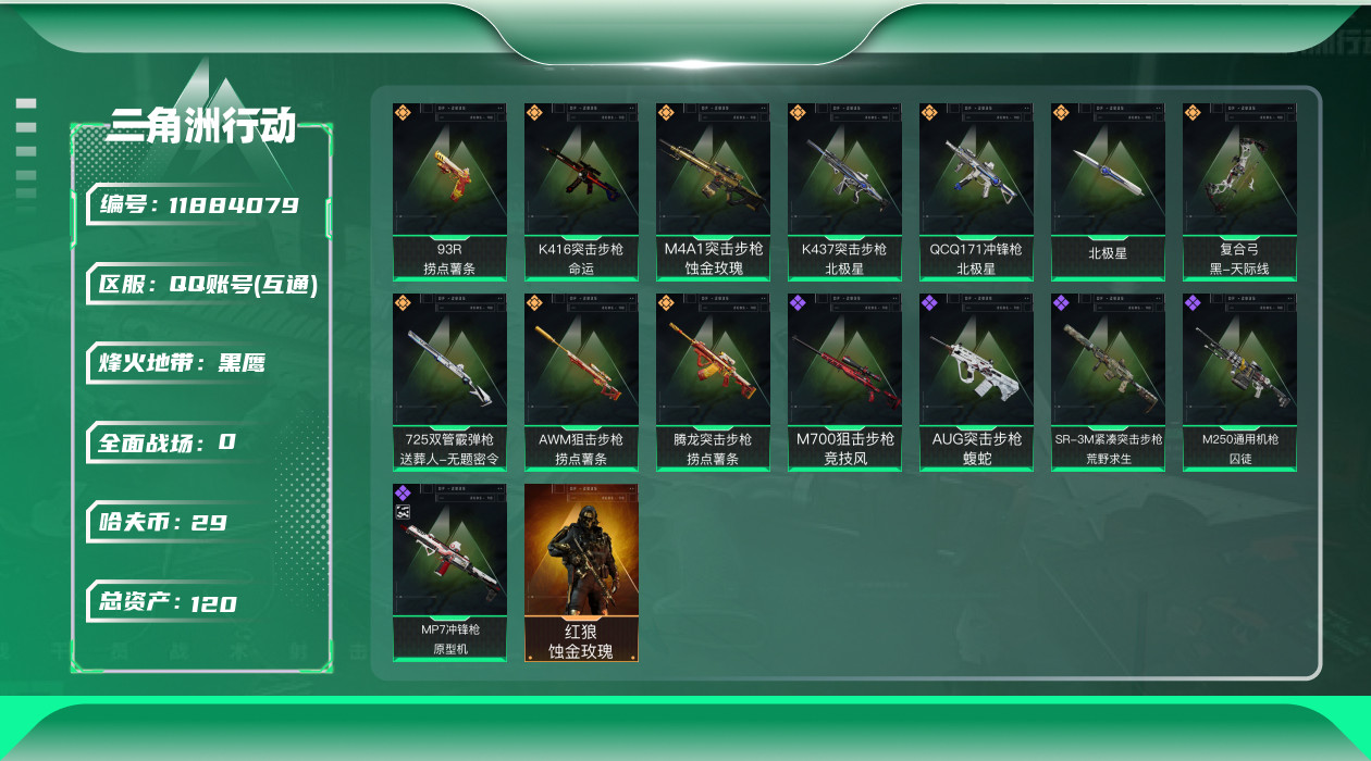 [11884079]总资产:120.3M 1干员外观 1近战传说 10传说枪械 哈夫币:29.711K 高级安全箱(9.17到期) 可二次 可修改实名 优质装备:近战-北极星,K416突击步枪-命运(典藏) 烽火地带段位:黑鹰 全面战场段位:无段位 传说武器皮肤:复合弓-黑-天际线,AWM狙击步枪-捞点薯条,QCQ171冲锋枪-北极星,腾龙突击步枪-捞点薯条,93R-捞点薯条,725双管霰弹枪-送葬人-无题密令,K437突击步枪-北极星,M4A1突击步枪-蚀金玫瑰 史诗武器皮肤:MP7冲锋枪-原型机(典藏),AUG突击步枪-蝮蛇,SR-3M紧凑突击步枪-荒野求生,M250通用机枪-囚徒,M700狙击步枪-竞技风 干员外观:红狼-蚀金玫瑰