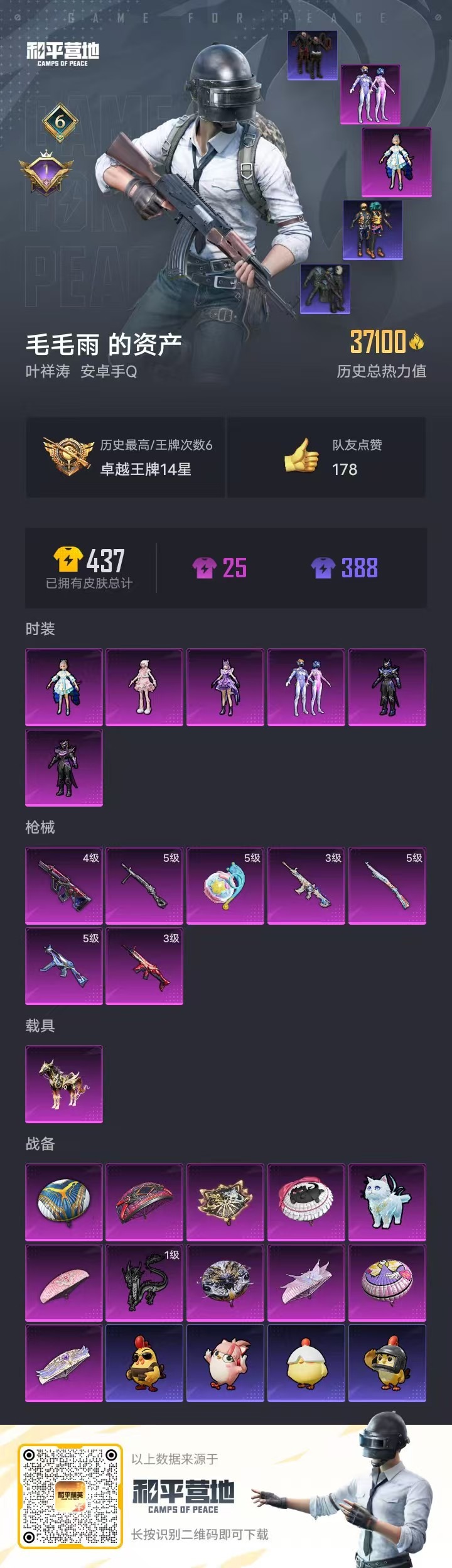 - PX_2090146- 安卓手Q-13王牌印记-12粉装-7特效枪-3载具-67648热力值-158套装-185枪皮-5卓越印记-0传奇印记 【12粉装】,放客神游,幻彩电音,憨憨奶龙,阿尔茜,小可学妹,岚岚物语,冰川幽秘,冰霜白皇,彩虹鹿灵,暗夜鎏金,未来歌姬,金丰海韵 【7特效枪】AKM-绿萝繁花-5级 SCAR-L-锦绣绵绵-5级 M416-五爪金龙-6级 AUG-暖羊咩咩-5级 Kar98