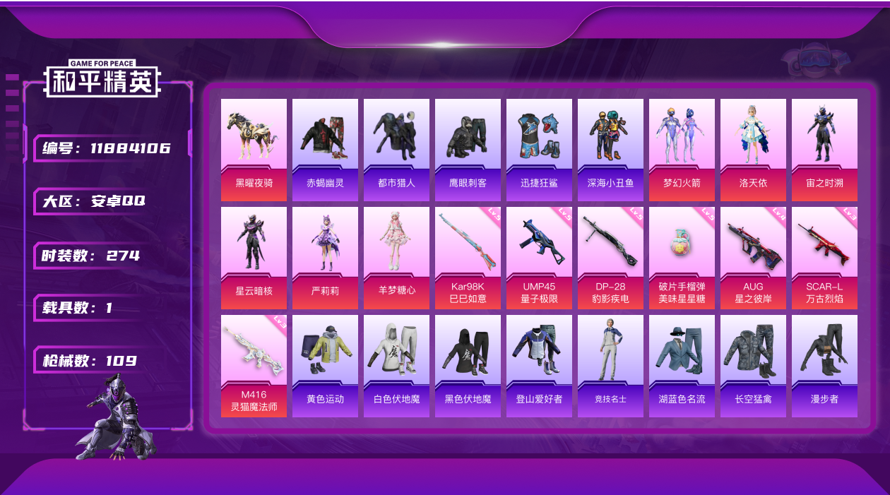 [11884106]6粉装 7特效枪 1载具 6印记 可二次 可修改实名 身法装备:赤蝎幽灵,都市猎人,暗影哥特(红眼罩) 优质装备:黑曜夜骑,赤蝎幽灵,都市猎人,梦幻火箭(新101)(新火箭少女101粉色套装),AUG星之彼岸,洛天依,SCAR-L 万古烈焰,UMP45量子极限,破片手榴弹-美味星星糖,M416-灵猫魔法师,羊梦糖心,Kar98K-巳巳如意 热门装扮:宙之时溯,星云暗核,严莉莉,迅捷狂鲨,鹰眼刺客,深海小丑鱼,都市猎人,赤蝎幽灵 稀有枪皮:DP-28-豹影疾电 五级特效枪:五级UMP45-量子极限,五级Kar98K-巳巳如意,五级破片手榴弹-美味星星糖,五级DP-28-豹影疾电 四级特效枪:四级AUG-星之彼岸 三级特效枪:三级M416-灵猫魔法师,三级SCAR-L-万古烈焰 紫色装扮:SS31特训套装,冰川特警,旭日情侣,SS30特训套装,SS33特训套装,快乐星愿,星梦畅游,军刀雅典娜,吉莉礼服,长空猛禽,缤纷果语,黄色运动,黑色伏地魔,龙的传人,龟仙人,冰河战士,龙魂突击队,蝶变,香桃花海,沙漠探路者,海岛探路者,清新柠檬,湖蓝色名流,登山爱好者,白色伏地魔,空岛之星,狂沙舞者,短笛,雏菊兔兔,萝兰蝴蝶,SS29特训,星途旅人,纯真浪花,热情海星,曼妙人鱼,SS28特训,卖崽青蛙,冰公主,鱼渊荷华,燕燕于飞,巳巳如意,竞技名士,暗影哥特(红眼罩),惊鸿侠骨,SS25特训,锦衣飞扬,焰鹰斗篷,幻羽潜行,幽夜迷踪,SS27特训,蝶吟花词,浪漫天命,SS26特训,耀粉歌者,蓝冰羽,SS32特训服(SS32特训套装),风舞幻音,绯格组合,漫步者,冰冻风暴 优质战备:圣堂之誓降落伞,墨龙九天降落伞,龙翔九天飞行器,星途旅人降落伞,江南烟雨降落伞,星之彼岸降落伞,绯穹魔姬降落伞,灵猫魔法师飞行器,灵猫魔法师降落伞,临安公主降落伞,环太平洋降落伞,梦幻火箭降落伞