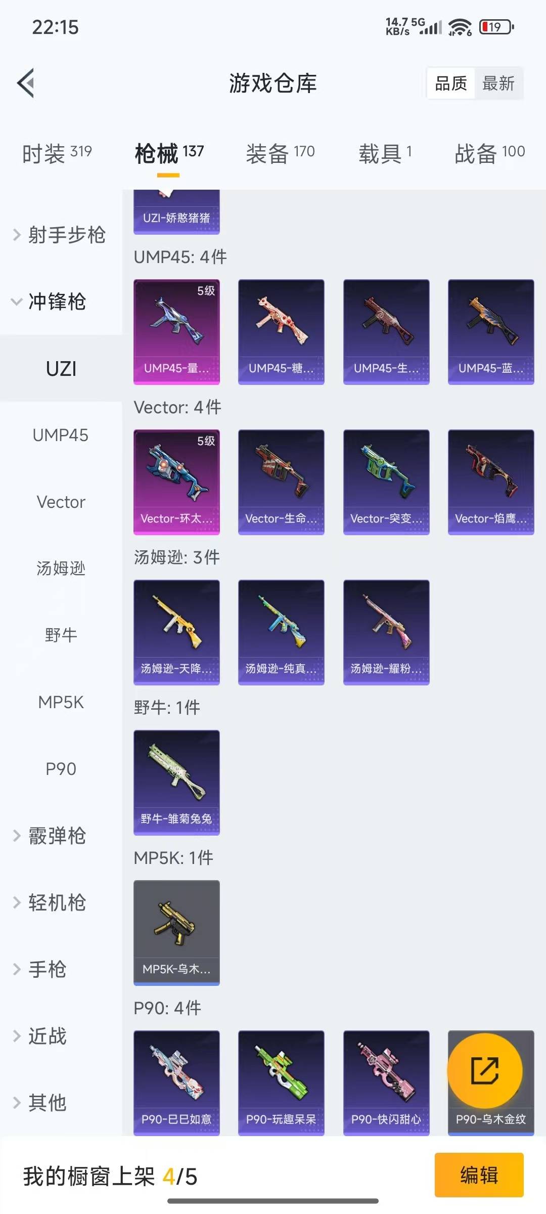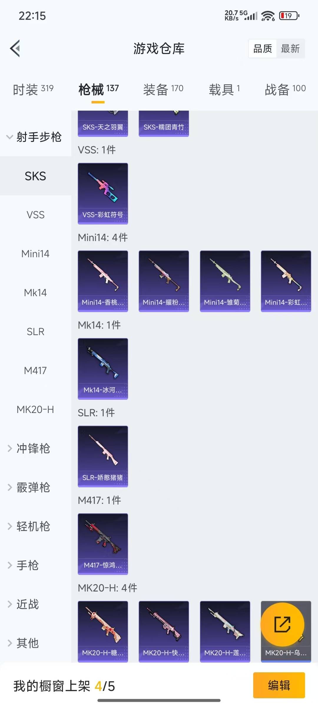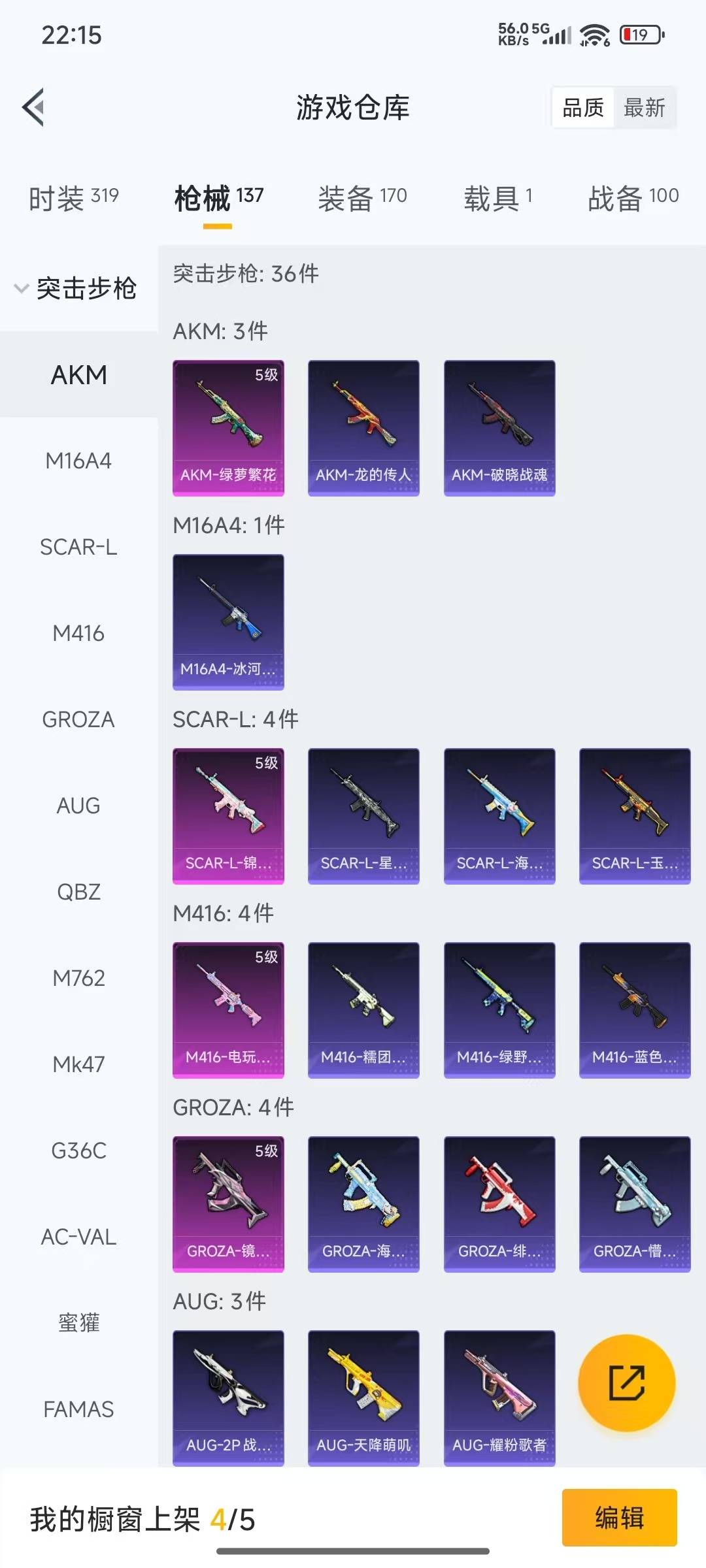 AKM-绿萝繁花,SCAR-L-锦绣绵绵,M416-电玩时刻,GROZA-镜光银凌,Kar98K-巳巳如意,UMP45-量子极限,Vector-环太平洋
