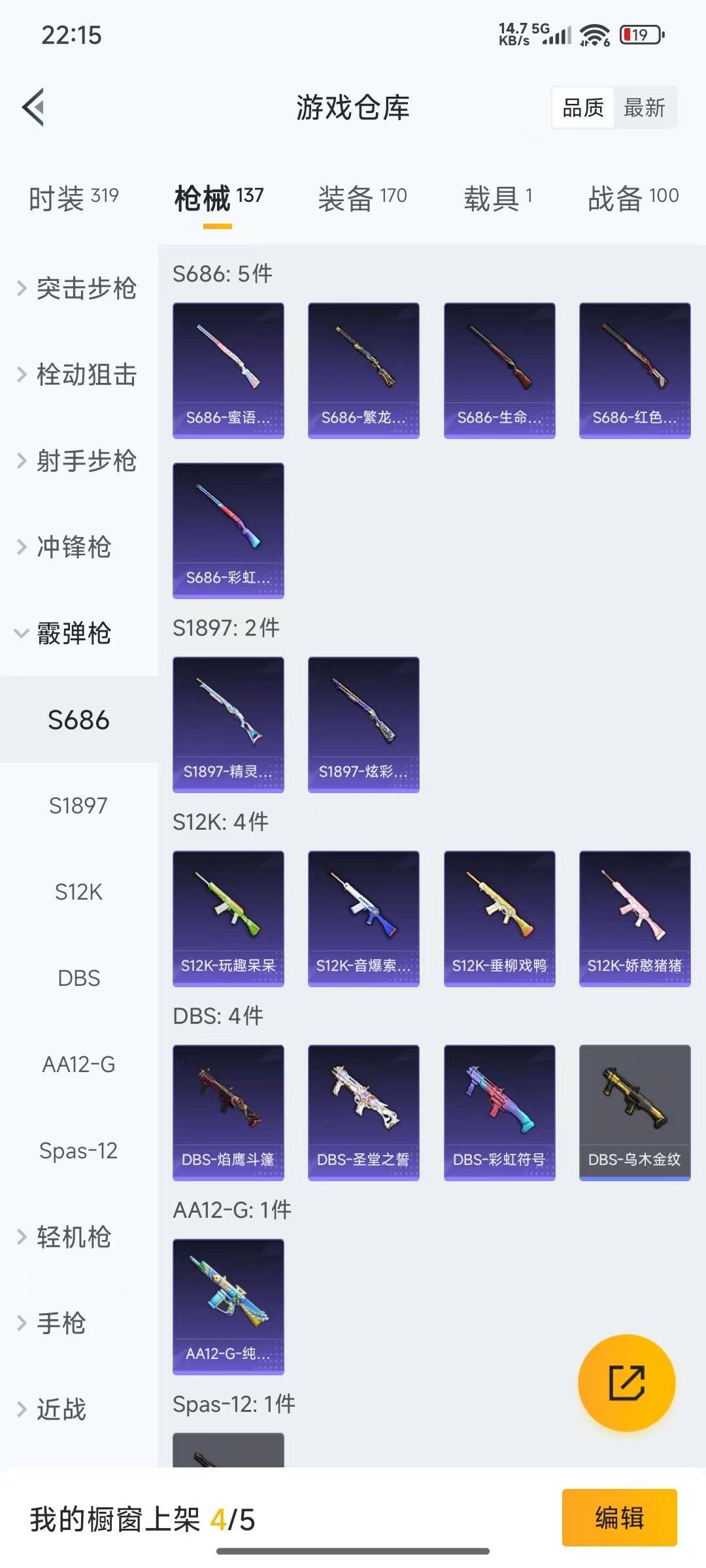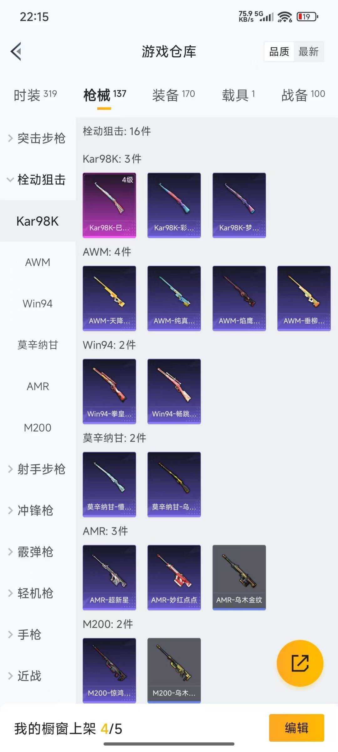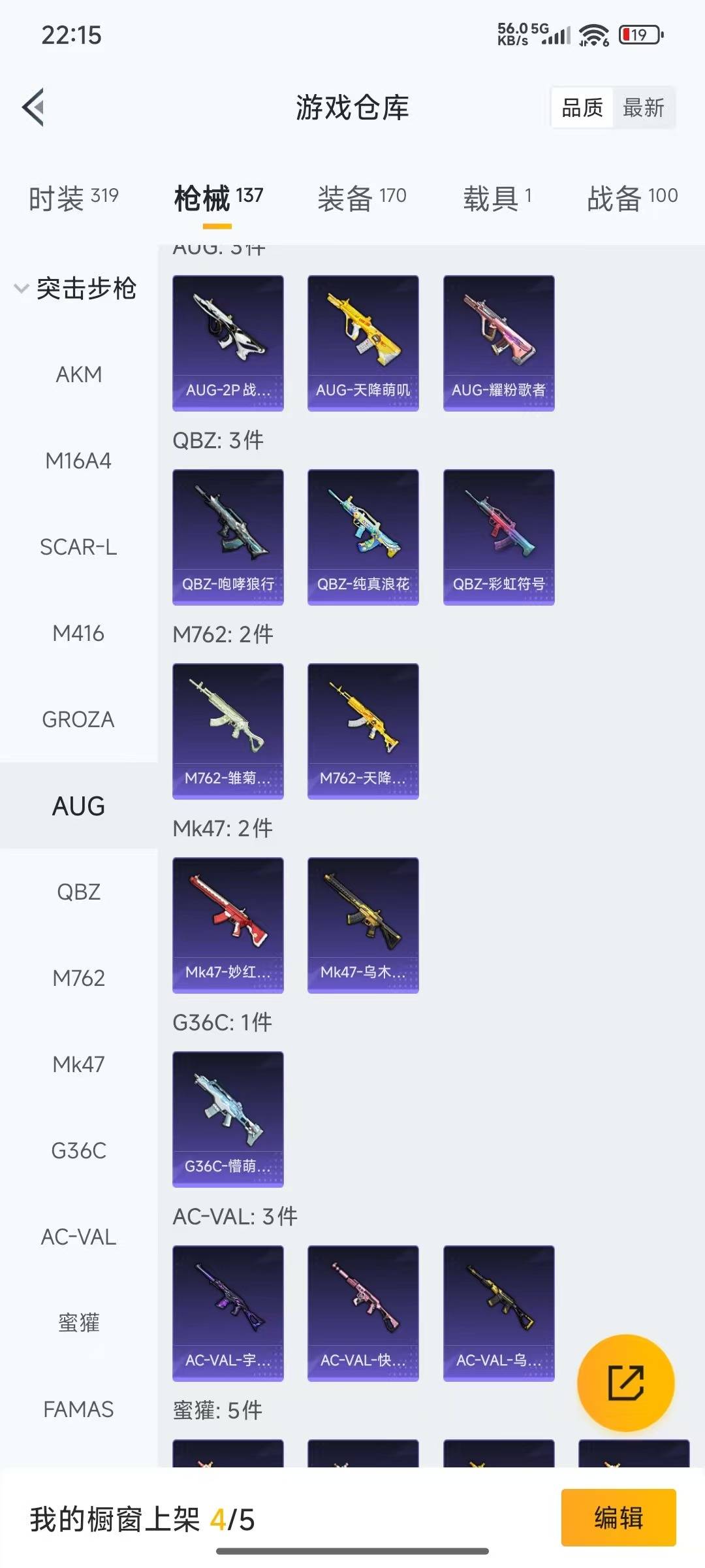 AKM-绿萝繁花,SCAR-L-锦绣绵绵,M416-电玩时刻,GROZA-镜光银凌,Kar98K-巳巳如意,UMP45-量子极限,Vector-环太平洋