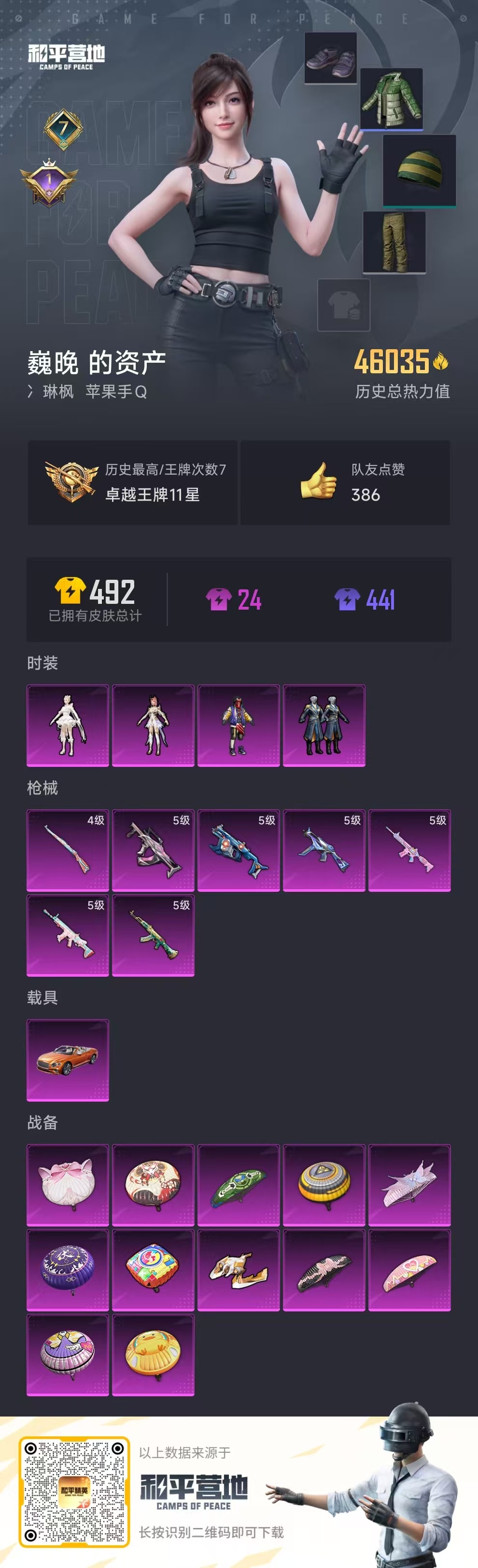 [11884156]4粉装 7特效枪 1载具 7印记 可二次 可修改实名 优质装备:宾利欧陆GT敞篷(火焰橘),天禅智恒,Vector环太平洋,AKM绿萝繁花,SCAR-L-锦绣绵绵,M416电玩时刻,UMP45量子极限,千金淑猫,GROZA-镜光银凌,Kar98K-巳巳如意 热门装扮:青空秋雨,圣堂之誓,梦魇先生 五级特效枪:五级UMP45-量子极限,五级GROZA-镜光银凌,五级M416-电玩时刻,五级SCAR-L-锦绣绵绵,五级AKM-绿萝繁花,五级Vector-环太平洋 四级特效枪:四级Kar98K-巳巳如意 紫色装扮:SS22特训,SS23特训,幻彩翩翩,妙红点点,龙舌兰冰茶,娇憨猪猪,萌趣咩咩,SS21特训,SS31特训套装,冰川特警,冷焰舞者,SS30特训套装,SS33特训套装,长空猛禽,霓虹街区,风暴特警,荷畔雨呱,缤纷果语,耀眼新星,荣耀,魅力单车,黄色运动,黑色伏地魔,龙的传人,龟仙人,冰河战士,龙魂突击队,蝶变,柠萌假日,海岛探路者,幻影武者,空岛之星,王牌教练,牛气满满,特殊使命,特训学院,小熊娃娃,雏菊兔兔,萝兰蝴蝶,SS29特训,拉斐尔,鹿角斗士,星途旅人,创世·幻影,纯真浪花,热情海星,曼妙人鱼,SS28特训,卖崽青蛙,玉兔迎春,巳巳如意,青团波波,糖糖葫芦,竞技名士,街头风暴,深海梦境,惊鸿侠骨,神气柴柴,懵萌河马,SS24特训(SS24特训套装),SS25特训,锦衣飞扬,湖雨初晴,焰鹰斗篷,幻羽潜行,幽夜迷踪,SS27特训,蝶吟花词,云霞荷露,SS26特训,春光漫游,快闪甜心,智谋强哥,萌黄之夏,光之冒险 优质战备:创世·救赎降落伞,拳皇·狂花道降落伞,星途旅人降落伞,公主华盖飞行器,忍者神龟降落伞,江南烟雨降落伞,千金淑猫降落伞,垂柳戏鸭降落伞,南国舞曲降落伞,拂晓神骑飞行器,炫光之旅降落伞,飒粉甜心降落伞,梦幻火箭降落伞,伏魔团降落伞