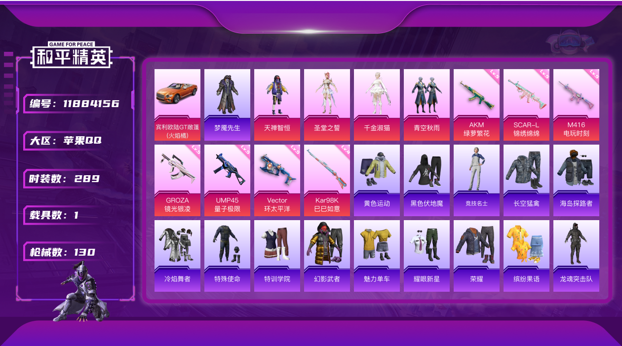 - PX_2102204- 苹果手Q-20王牌印记-有战神框-13粉装-14特效枪-1载具-热力值-222套装-339枪皮-8卓越印记-8传奇印记 【13粉装】,梦幻火箭,怪诞乔克,桃粉嫣然,星穹咏叹调,狂花道·不知火舞,深海曼妙,月影灵韵,智能音符,莲影清波,冰霜白皇,音爆索尼克,香水柠檬,数码大师 【14特效枪】AKM-炫紫旋律-6级 SCAR-L-青春物语-7级 SCAR-L-锦绣绵绵-5级 M