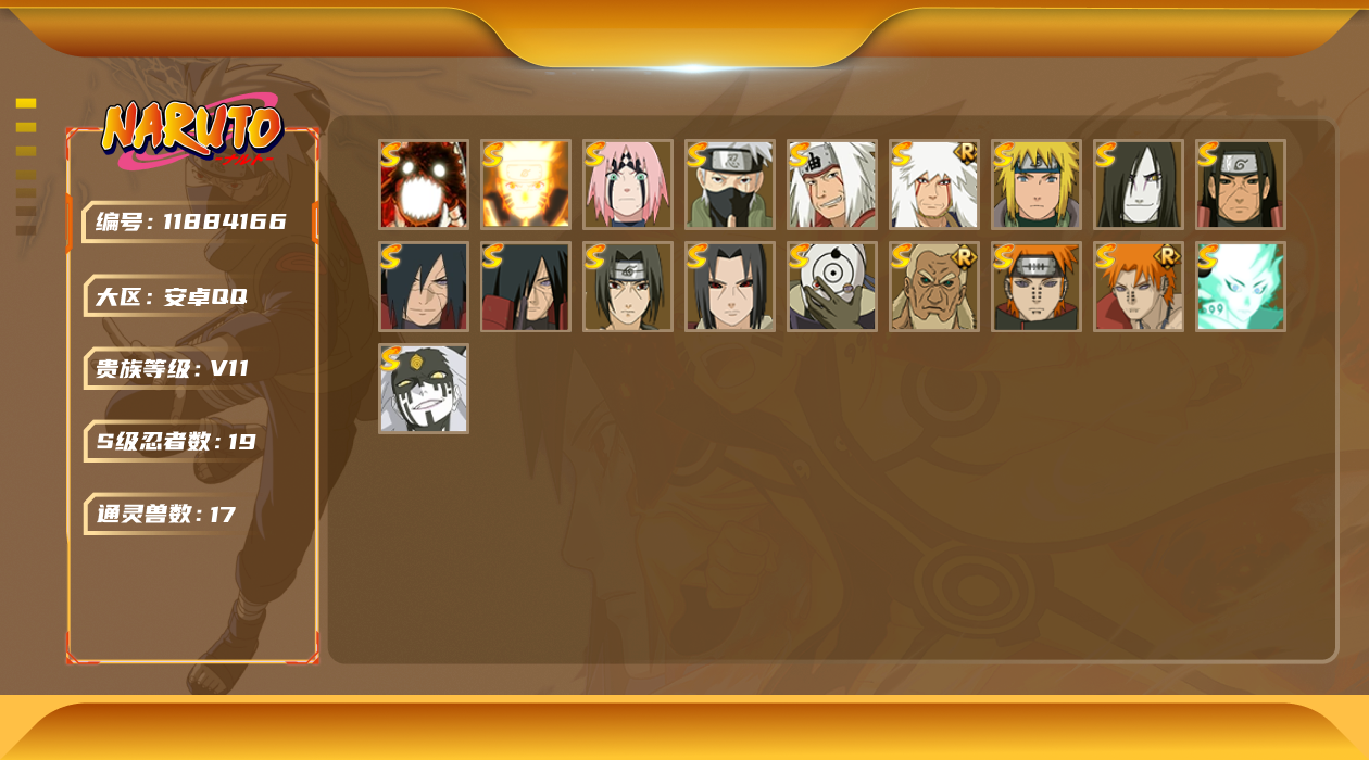 [11884166]V11 19S忍 32A忍 17通灵 762.2W战力 可二次 可修改实名 优质装备:熊猫,千手柱间「秽土转生」,宇智波鼬「秽土转生」,佩恩·天道「超」,宇智波斑「秽土转生」,艾「三代目雷影」,“宇智波斑” 「白面具」,漩涡鸣人 「九喇嘛连结」,春野樱 「忍界大战」,宇智波斑「秽土转生·解」,大筒木桃式,旗木卡卡西「须佐能乎」,大筒木舍人 「最终章」,自来也 「传说中的三忍」,漩涡鸣人 「暴怒·第六尾」 S级忍者:自来也 「舞之豪杰」,宇智波鼬 「须佐能乎」,佩恩「天道」,波风水门,大蛇丸