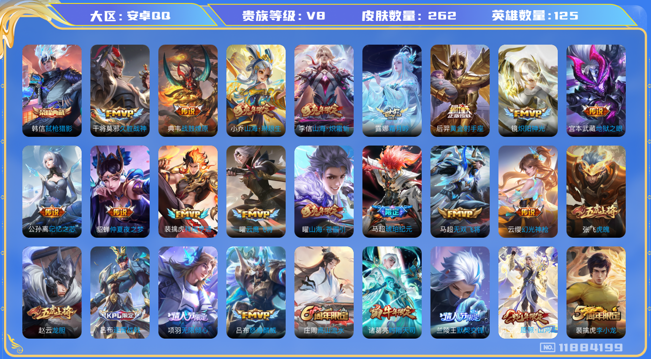 [11884199]V8 1典藏 27传说 125英雄 262皮肤 可修改实名 优质装备:弑枪猎影(韩信典藏),黄金射手座,云鹰飞将(小将军),久胜战神,炽阳神光,仲夏夜之梦(大飞蛾),地狱之眼,无双飞将,山海·炽霜斩(李信年限),山海·琳琅生(小乔年限),山海·苍雷引(电光曜子),记忆之芯(机甲兔),霜月吟,琥珀纪元马超 传说皮:典韦战鼓燎原,祥瑞亨通,幻光神枪 珍宝阁皮:优雅恋人,女武神 限定皮:愿照·九州拓(澜年限),愿照·岁时盈(虞姬年限),愿照·山河定(司空震年限),逐霄战戟,时雨天司(水龙头),山海·碧波行(瑶年限),无限倾心-项羽,高山流水,无限倾心-虞姬,齐天大圣,怒海麟威,五谷丰年,冰锋战神,龙胆,虎魄,李小龙,默契交锋-兰陵王,默契交锋-花木兰,寅虎·赤拳(老虎年限),时之祈愿-云中君,神器·万象笔,山海·玄木吟(马可年限) 史诗皮:器灵·浮梦炉,化蝶舞,星界战将,龙之律动,雪豹·霜爪,茶境仙,东方月初,芈月浮光幕影,琥珀纪元伽罗,蔬乡物语(鲁班七号),紫霞仙子,白龙吟,黄金分割率,特工魅影,千年之狐,永昼,江河有灵,魅语,百解令(蒙犽),高渐离燃音魔法,蒙恬荣光圣徽,无限星赏官,匿光破解者,偶像歌手,晚萤,电玩·爆裂旋风,暗夜猫娘,猫狗日记-大乔,时之恋人-孙尚香,乱世虎臣,节奏热浪,修罗,女仆咖啡,摇滚巨星,水果甜心,星夜王子,暗隐猎兽者,幽灵船长,鬼剑武藏,暗渊魔法,心灵战警,乐园奇幻夜,地狱岩魂,纤云弄巧,繁星吟游(呼啦呼啦),拒霜思,缤纷独角兽,乘风破浪,逐浪之夏,龙鼓争鸣,水晶猎龙者,曙光守护者,热力回旋,金属风暴,圣诞恋歌,鹰眼统帅,魅力维加斯,黎明之约,赏金猎手,天秀·音浪,滕王阁序,无心,玫瑰异探
