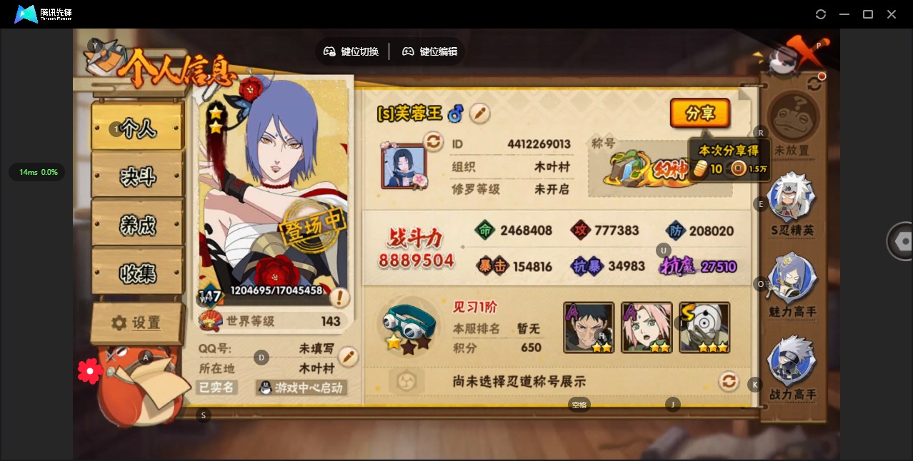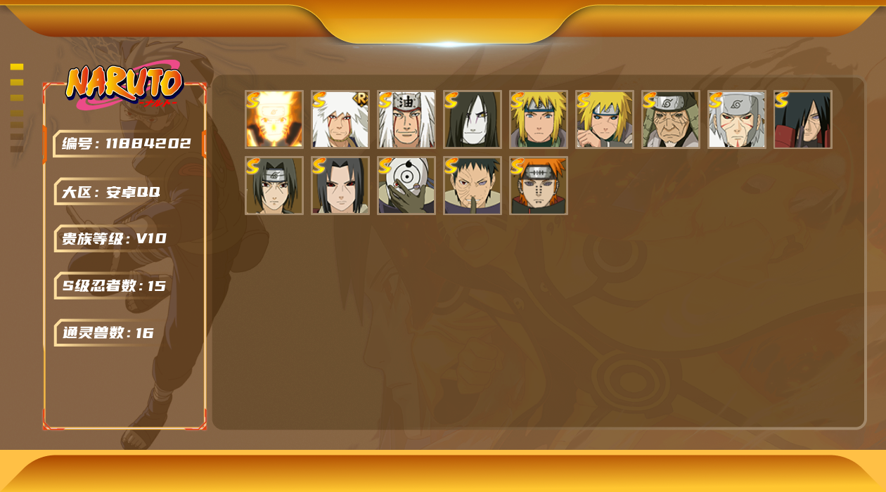 [11884202]V10 15S忍 34A忍 16通灵 888.9W战力 可二次 可修改实名 优质装备:宇智波鼬「秽土转生」,宇智波斑「秽土转生」,千手扉间「秽土转生」,波风水门「秽土转生」,猿飞日斩「秽土转生」,宇智波带土 「忍界大战」,“宇智波斑” 「白面具」,漩涡鸣人 「九喇嘛连结」 S级忍者:自来也 「舞之豪杰」,宇智波鼬 「须佐能乎」,佩恩「天道」,波风水门,大蛇丸,自来也