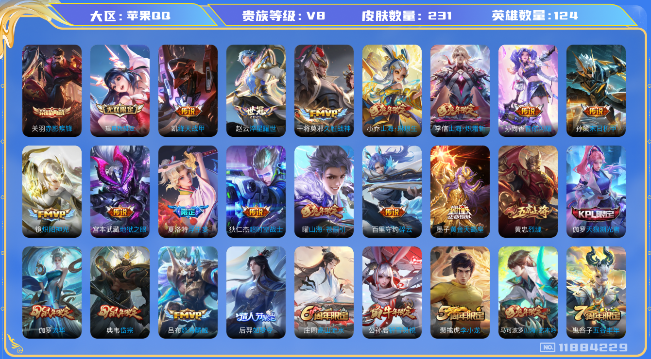 - [11626365]V7 1典藏 13传说 125英雄 265皮肤 可修改实名 优质装备:赤影疾锋,云鹰飞将(小将军),猫影幻舞,一念神魔,超时空战士-狄仁杰,碎云,炽翼辉光(娃娃菜牛角包),记忆之芯(机甲兔) 传说皮:幻光神枪 珍宝阁皮:妄想食味,蔷薇恋人,玩趣恶龙 限定皮:鸣野蒿,时雨天司(水龙头),高山流水,诗剑行,齐天大圣,怒海麟威,五谷丰年,岱宗(典韦年限),天狼绘梦者,李小龙,逐梦之影,默契交锋-花木兰,孙行者,猪悟能,青春决赛季,冰霜恋舞曲 史诗皮:破空之剑,紫霞仙子,白龙吟,黄金分割率,特工魅影,千年之狐,永昼,百相守梦(关羽),江河有灵,百解令(蒙犽),魅语,冰冠公主,青蛇,末日机甲-吕布,猫狗日记-孙策,猫狗日记-大乔,时之恋人-孙尚香,乱世虎臣,节奏热浪,修罗,女仆咖啡,摇滚巨星,水果甜心,绅士熊喵,天才门将,星夜王子,心灵骇客,德古拉伯爵,幽灵船长,鬼剑武藏,心灵战警,舞动绿茵,繁星吟游(呼啦呼啦),拒霜思,缤纷独角兽,乘风破浪,逐浪之夏,水晶猎龙者,曙光守护者,唤灵魅影,金属风暴,圣诞狂欢,圣诞恋歌,鹰眼统帅,魅力维加斯,无心,未来纪元-赵云