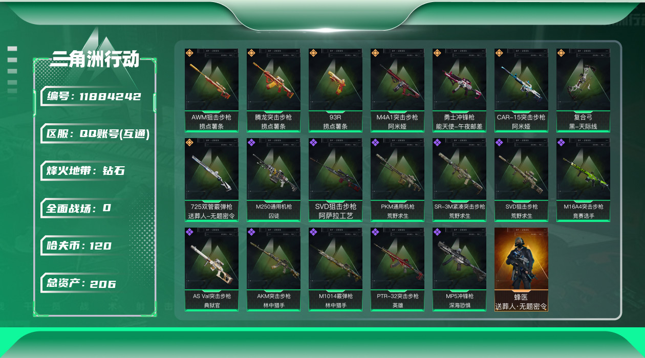 [11884242]总资产:206.9M 1干员外观 8传说枪械 哈夫币:120K 高级安全箱(2×3)9.15号到期 可二次 可修改实名 烽火地带段位:钻石 全面战场段位:军士长 传说武器皮肤:93R-捞点薯条,AWM狙击步枪-捞点薯条,腾龙突击步枪-捞点薯条,CAR-15突击步枪-阿米娅,勇士冲锋枪-能天使-午夜邮差,复合弓-黑-天际线,M4A1突击步枪-阿米娅,725双管霰弹枪-送葬人-无题密令 史诗武器皮肤:M16A4突击步枪-竞赛选手,PKM通用机枪-荒野求生,MP5冲锋枪-深海恐惧,AKM突击步枪-林中猎手,SR-3M紧凑突击步枪-荒野求生,M1014霰弹枪-林中猎手,PTR-32突击步枪-英雄,SVD狙击步枪-荒野求生,AS Val突击步枪-典狱官,M250通用机枪-囚徒,SVD狙击步枪-阿萨拉工艺 干员外观:蜂医-送葬人·无题密令(S5)